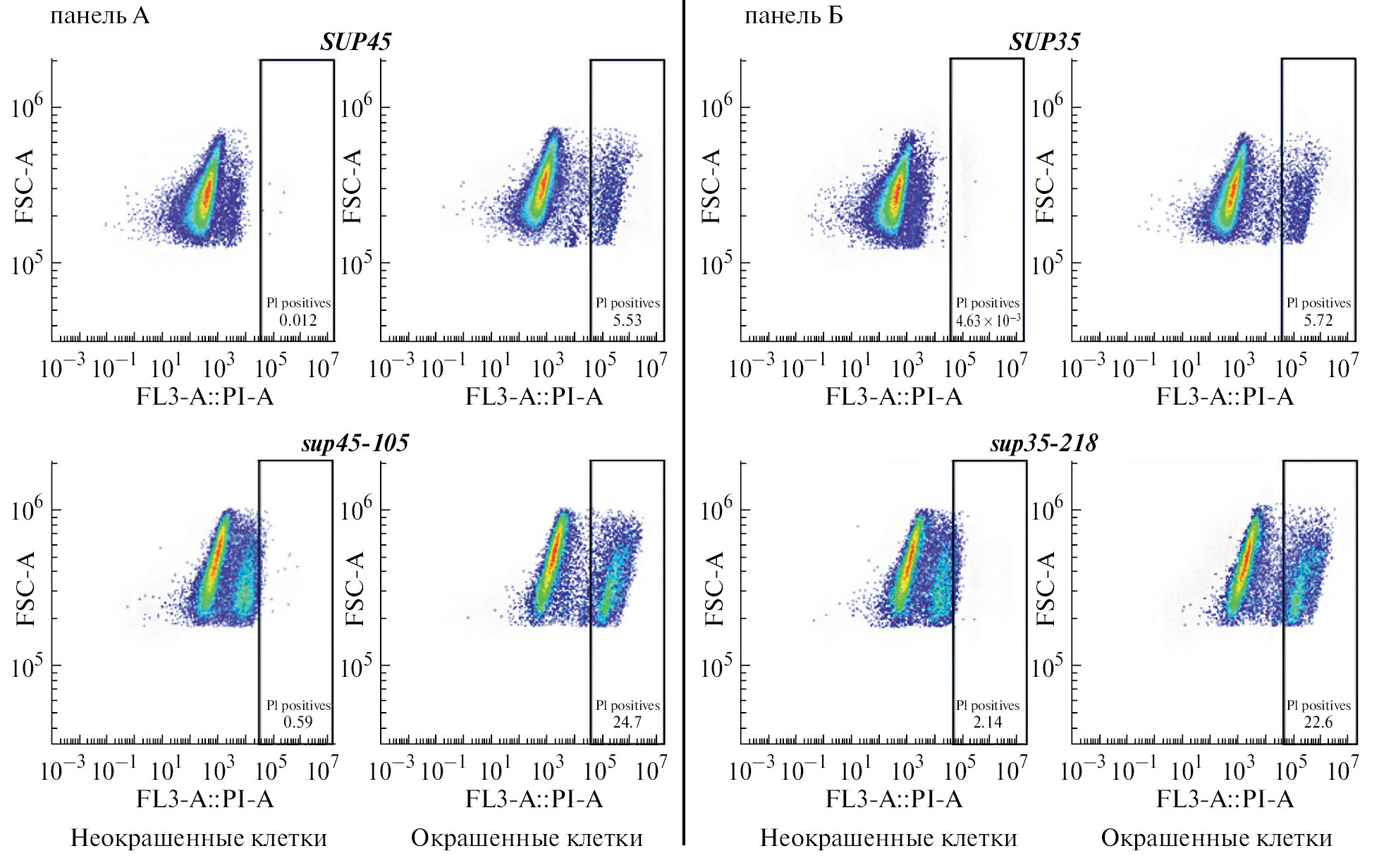 В результате настоящего исследования мы выявили значимые различия размеров субпопуляций окрашенных, т. е. мертвых, клеток у штаммов дикого типа по сравнению с мутантом sup45 или sup35, соответственно (рис. 1).