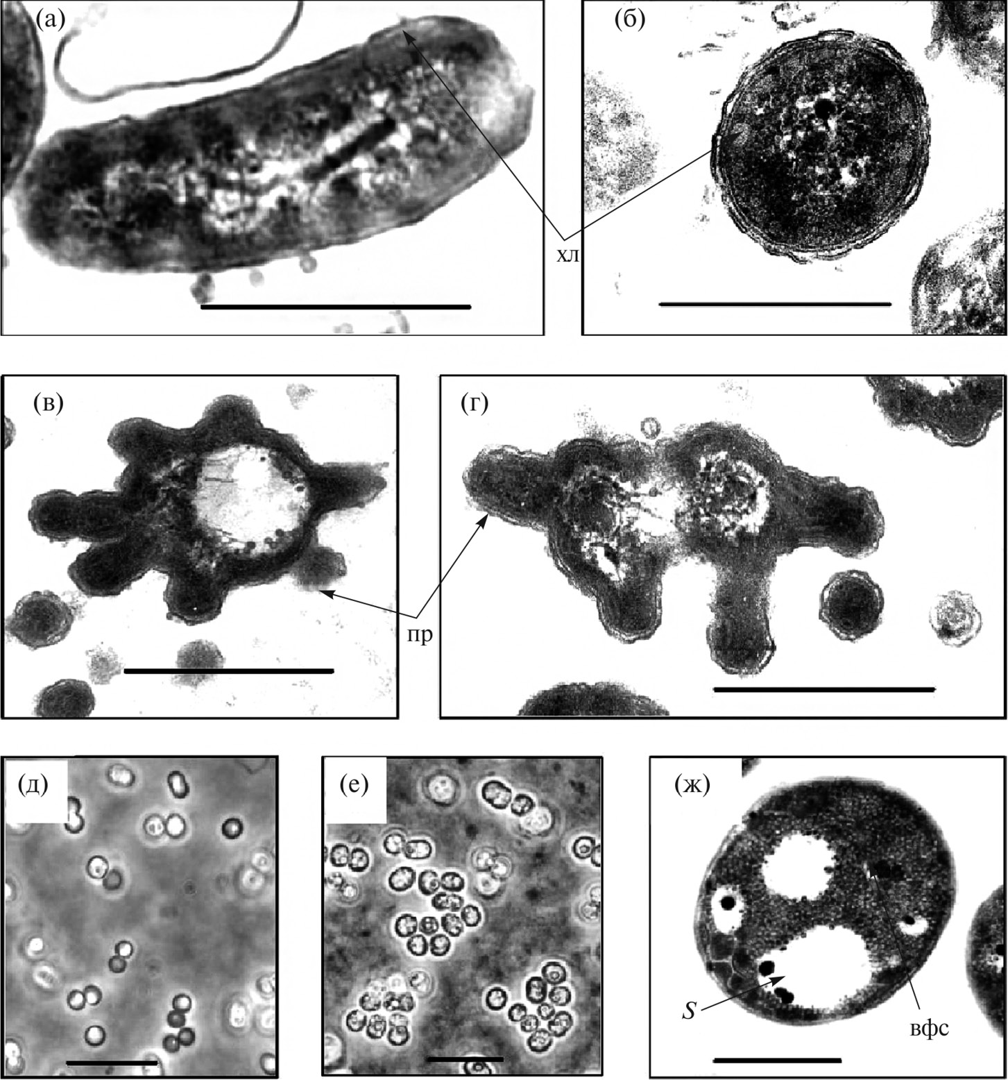 Рис. 5. Тонкое строение выделенных культур АФБ: а, б — Chlorobium phaeovibrioides; в, г — коричневоокрашенные Prostecochloris aestuarii с простеками; ж — Thiocapsa sp.; д — Thiocystis sp.; e — Tiocapsa sp. Электронный микроскоп (а–г, ж). Световой микроскоп, фазовый контраст (д, е). Обозначения: ПР — клеточные выросты — простеки; ХС — антенные структуры — хлоросомы; ВФС — фотосинтетические структуры везикулярного типа; S — внутриклеточные включения элементной серы. Масштабная метка — 0.5 мкм