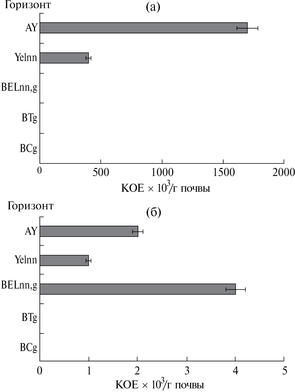Рис. 1. Численность Mn-окисляющих (а) и Fe-окисляющих (б) микроорганизмов в почвенном мелкоземе