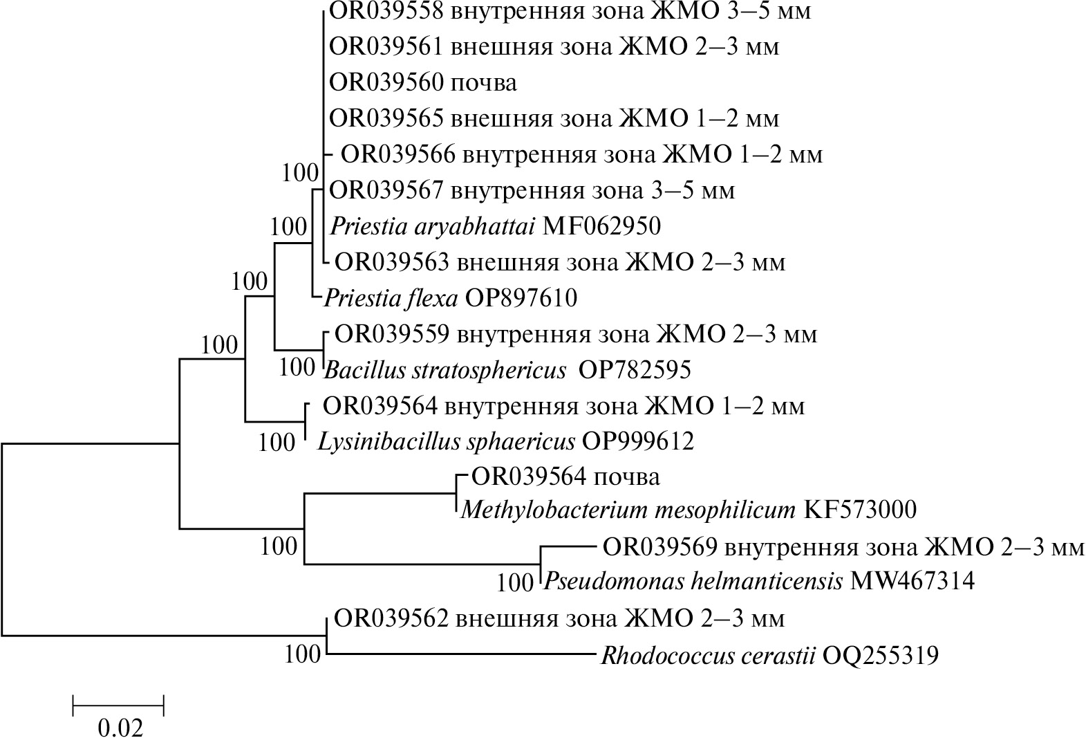 Таксономическое положение Fe- и Mn-окисляющих бактерий, изолированных из почвенного мелкозема и ортштейнов. При изучении таксономического положения выделенных из почв и ЖМО бактерий выявлено, что все штаммы относятся к трем филумам: Pseudomonadota, Actinomycetota и Bacillota (рис. 2). Штаммы OR039558, OR039558, OR039561, OR039565, OR039566, OR039567 имели высокую степень родства (99.51, 98.23, 100, 99.77, 99.47 и 99.47% соответственно) с гомологом MF062950 Priestia aryabhattai, полученным с корней томатов (Китай). Штамм OR039563 был гомологичен бактерии вида Priestia flexa (99.62%). Представители рода Priestia способны осаждать и накапливать металлы на поверхности и внутри клеток (Ghosh et al., 2018; Shahid et al., 2022). В ЖМО исследуемых почв роль полученных изолятов может быть схожей. У штамма OR039559 отмечена высокая степень гомологии со штаммом Bacillus stratosphericus (OP782595). Бактерии этого рода способны аккумулировать металлы, в том числе Mn2+, из различного субстрата без изменений скорости роста (Li et al., 2023). Штамм OR039562 имел высокий процент сходства (99.88%) с Rhodococcus cerastii (OQ255319). Известно, что в составе рода Rhodococcus есть виды, способные окислять Mn, продуцируя Mn-зависимые пероксидазы DyP-типа (Singh et al., 2013; Jofre et al., 2021). Также у некоторых Rhodococcus spp. активность гидроксилазы зависит от Mn, и бактерии специально используют гетерометаллический кофактор Mn/Fe для осуществления каталитической функционализации неактивированной первичной связи углерода (Powell et al., 2023). Вероятно, выделенный нами штамм также может трансформировать Mn, окисляя и осаждая его.