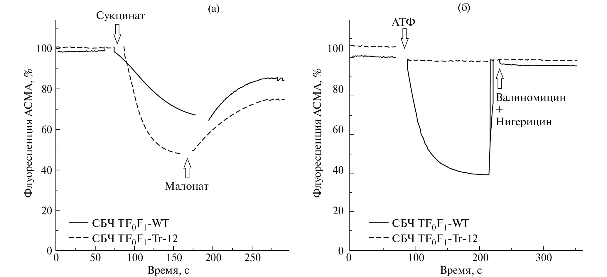 Чтобы непосредственно наблюдать за переносом H+ через мембрану СБЧ, мы воспользовались красителем 9-амино-6-хлоро-2-метоксиакридином (АСМА), флуоресценция которого гасится при образовании градиента рН на мембране (Lapashina et al., 2019). Введение мутаций в мембранную часть F0F1 могло привести к появлению пассивной протонной проводимости через фермент. Чтобы проверить это экспериментально, к мембранным частицам добавляли субстрат дыхательной цепи сукцинат, а затем ингибитор сукцинатдегидрогеназы малонат. На рис. 1а видно, что и на СБЧ с TF0F1-WT, и на СБЧ с TF0F1-Tr-12 при добавлении сукцината можно наблюдать гашение флуоресценции, а при добавлении малоната — ее восстановление.