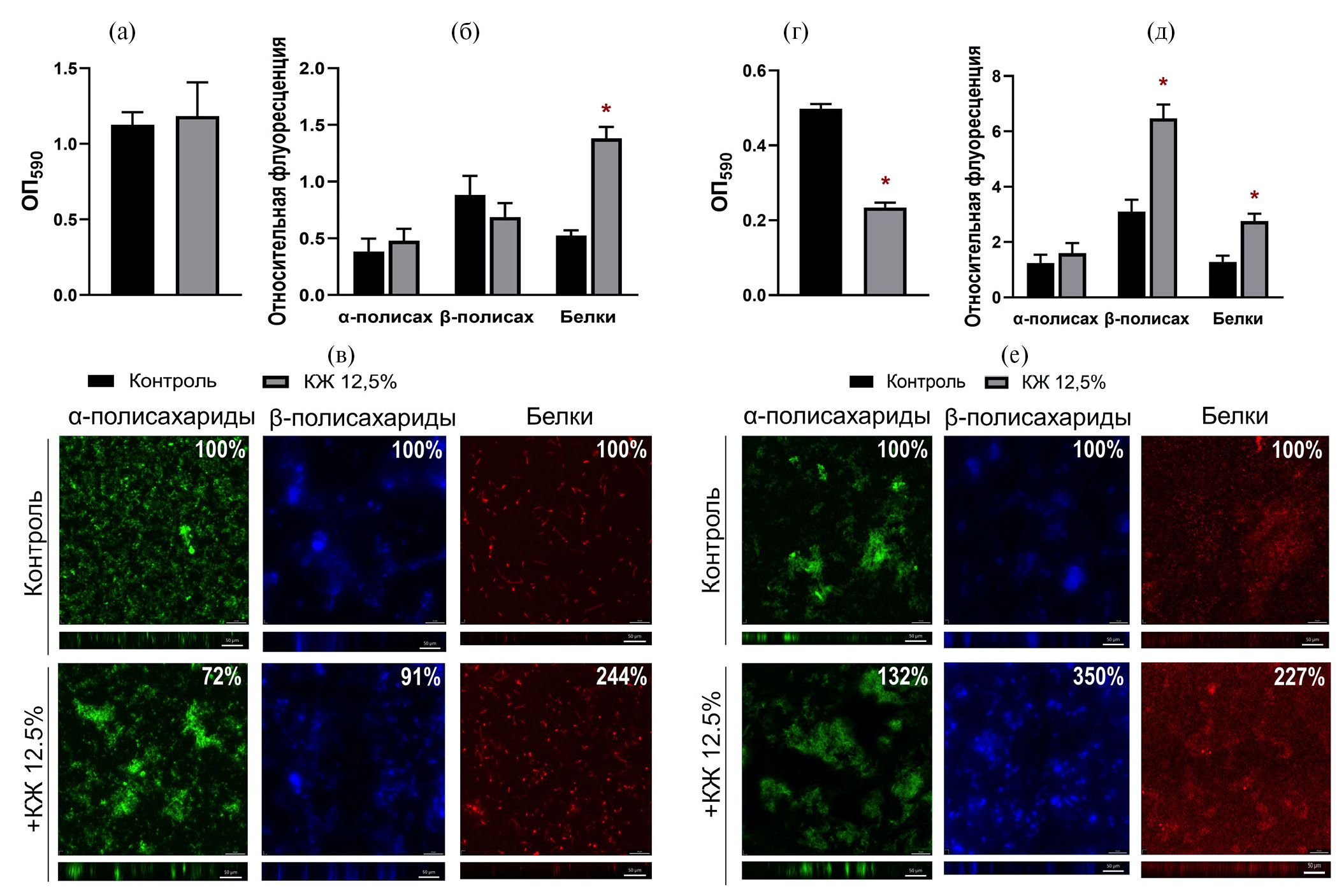 Внесение БКЖ S. aureus к зрелой биопленке K. pneumoniae не влияло на общую биомассу (рис. 1а), однако приводило к увеличению белков более чем в 2 раза по сравнению с контрольными образцами, тогда как количество α- и β-полисахаридов значимо не изменялось (рис. 1б). Количественный анализ данных микроскопии подтвердил полученные результаты (рис. 1в).