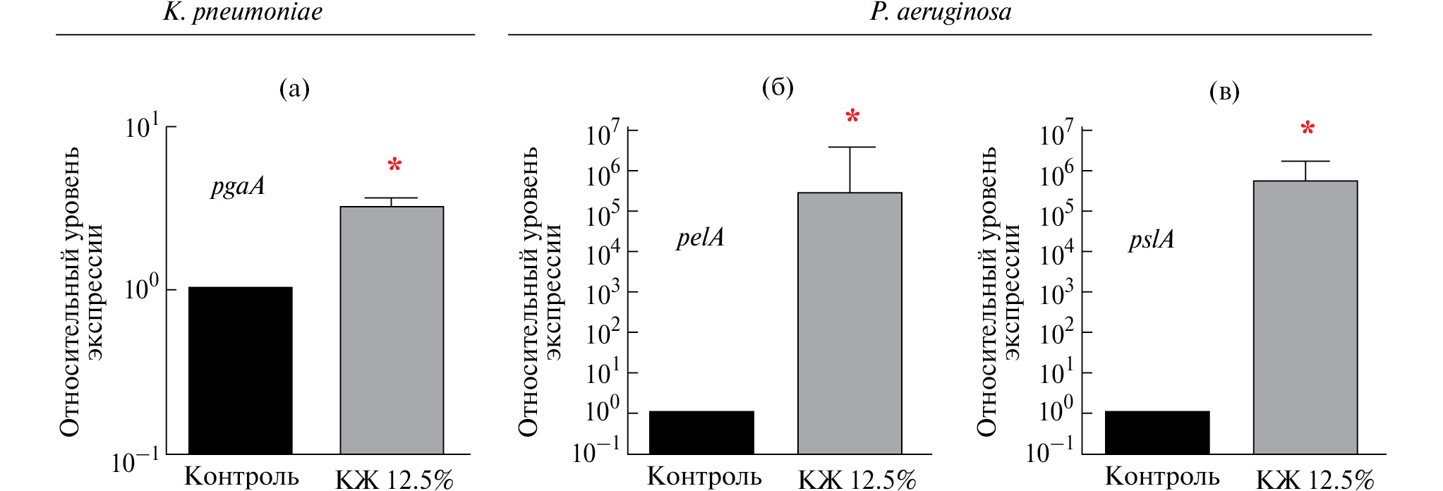 Рис. 2. Относительная экспрессия генов, кодирующих внеклеточные полисахариды биопленок K. pneumoniae (а) и P. aeruginosa (б, в) без обработки (контроль) и в присутствии культуральной жидкости золотистого стафилококка (+12% КЖ)