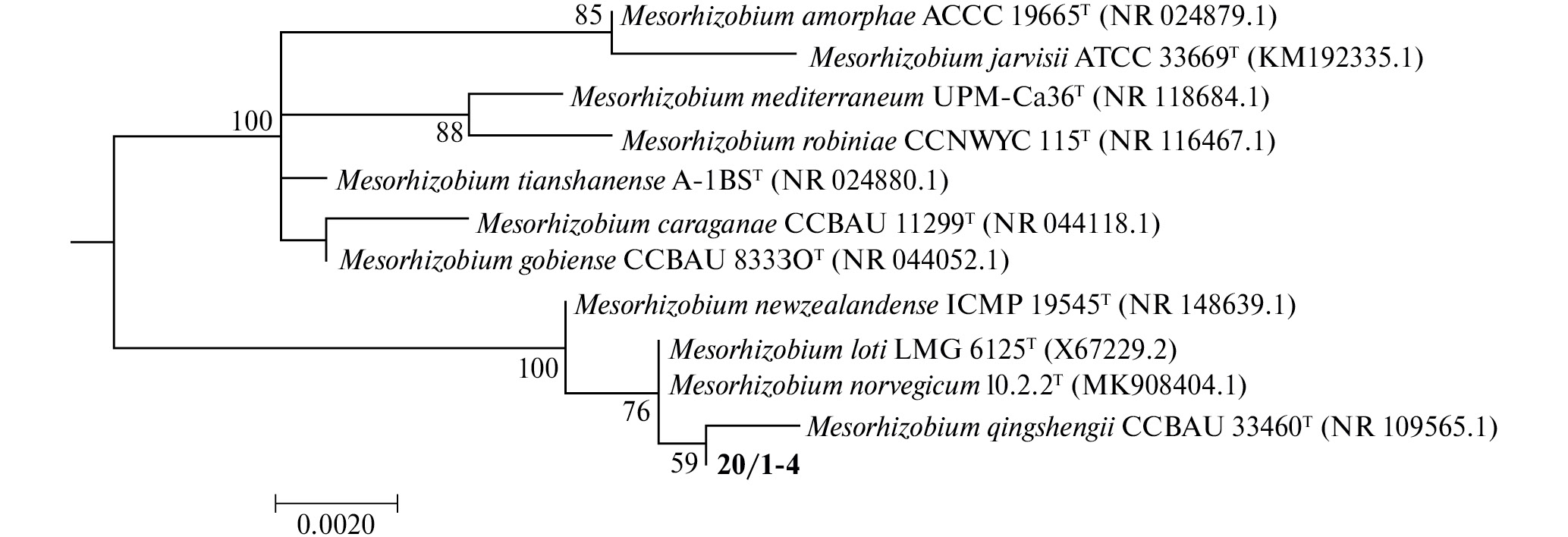 Штамм 20/1–4 имел 100%-е сходство гена rrs со штаммами Mesorhizobium norvegicum 10.2.2T и M. loti NZP2213T, выделенными из корневых клубеньков кормового бобового растения Лядвенца рогатого (Lotus corniculatus L.), соответственно, в Норвегии (Kabdullayeva et al., 2020) и Новой Зеландии (Jarvis et al., 1982). Показано, что M. loti NZP2213T способен формировать эффективный симбиоз c разными видами рода Lotus. На rrs-дереве штамм 20/1–4 формировал кластер со штаммами M. qingshengii CCBAU33460T, M. norvegicum 10.2.2T и M. loti NZP2213T с 76% уровнем поддержки, тогда как на дереве, построенном на основе конкатемеров генов atpD, dnaK, rpoB и gyrB, он группировался на уровне 99%-ной поддержки со штаммами M. norvegicum 10.2.2T и M. loti NZP2213T (рис. 3 и 4).