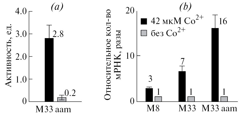 Штамм R. rhodochrous M33 aam в течение 1 сут выращивали на жидкой среде в присутствии и в отсутствие ионов кобальта и измеряли ациламидазные активности клеток и уровни транскрипции Pnh569 (с помощью RT-qPCR). В присутствии ионов кобальта ациламидазные активности клеток и уровни транскрипции активировались сходно (в 14 и 16 раз выше, чем без ионов кобальта, рис. 2a и 2б). Дополнительно, сходные тенденции кобальт-зависимой активации транскрипции были обнаружены в тех же условиях роста в штаммах R. rhodochrous М8 и М33, содержащих под контролем Pnh569 гены nhmBA (рис. 2б).