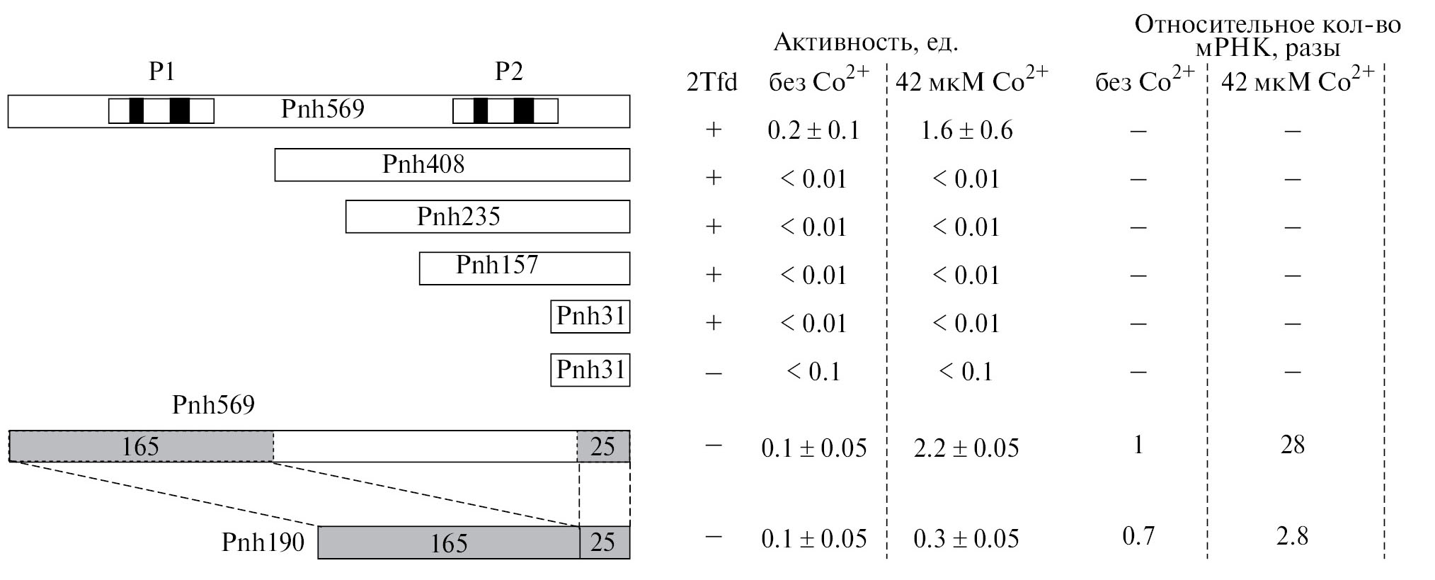 Локализация кобальт-индуцируемого промотора. Промоторная активность исследуемой регуляторной области была обнаружена ранее (Lavrov et al., 2018), однако детальная проверка предсказаний промоторов в ней требовала конструирования экспрессионных кассет, содержащих разные делеционные варианты этой области. Для проверки функционирования предполагаемых промоторов P1 и P2, входящих в регуляторную область Pnh569, была сконструирована серия автономно реплицирующихся плазмид на базе плазмиды pRY16 (Lavrov et al., 2018), содержащих варианты экспрессионной кассеты 2Tfd-PnhN-aam-nhmG-cblA. В этих вариантах репортерный ген ациламидазы aam находился под контролем вариантов регуляторной области разной протяженности: Pnh569, Pnh408, Pnh235, Pnh157, Pnh31 (индекс обозначает длину варианта от старт-кодона). Фрагмент 2Tfd (двойной терминатор транскрипции из бактериофага fd) был введен для снижения влияния возможных вышележащих промоторов на активность исследуемого участка. Также был сконструирован контрольный вариант с максимально короткой регуляторной областью Pnh31, не содержавший 2Tfd (рис. 3а).