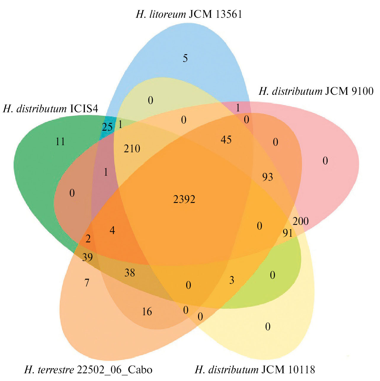 Рис. 1. Диаграмма Венна, демонстрирующая уникальные и ортологичные группы генов для геномов H. distributum ICIS4, H. distributum JCM9100 (GCA_000337055), H. distributum (GCF_000337335), H. litoreum JCM13561 (GCA_000337395), H. terrestre 22502 (GCA_009856455).