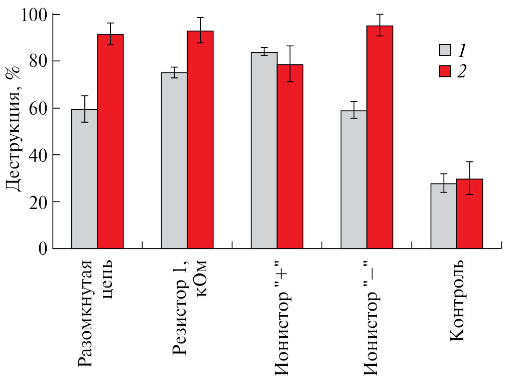В течение эксперимента ионисторы, по мере разрядки менее 1 В, заряжали до 1.2 В. Отмечена значительно более быстрая разрядка ионистора, подключенного с обратной полярностью. Высокие значения напряжения для вариантов “разомкнутая цепь” и “резистор 1 кОм”, не связанных с искусственными источниками напряжения, показали отсутствие токсического действия данной концентрации пестицида на электрогенную микробиоту, обычно выражающегося в значительном снижении электрогенеза (Lu et al., 2020). Влияние внешней электростимуляции проявлялось в вариантах опыта с автохтонной микрофлорой, присутствовавшей в донных отложениях. Максимальное значение деструкции было отмечено для варианта, где был подключен ионистор с прямой полярностью подключения (ионистор “+”) – 84.0 ± 1.7%. Минимальные значения отмечены для разомкнутой цепи и ионистора с обратной полярностью подключения: 59.4 ± 5.7 и 59.0 ± 3.5% соответственно. В случае внесения клеток штамма Shewanella oneidensis MR-1 отмечено значительное возрастание показателя, варьировавшего в пределах 78.8 ± 7.7–95.2 ± 4.6%, при этом ключевым для деструкции являлось наличие электропроводящего углеродного войлока, а отличия между вариантами опыта, различающимися внешней цепью, были незначительными. В контроле показатели деструкции были минимальными (27.7 ± 4.0–29.7 ± 6.0%) и не зависели от внесения шеванеллы.