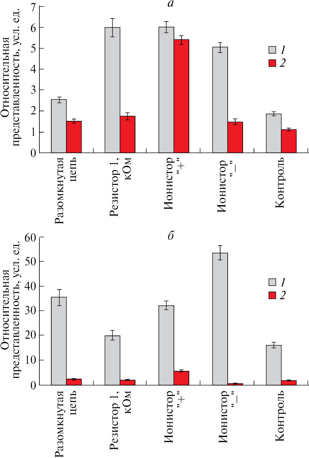 Рис. 2. Относительная представленность генов краситель-обесцвечивающих пероксидаз DyP-типа и трансмембранного белка дыхательной цепи MtrB в случае автохтонной микрофлоры донных отложений (а) и автохтонной микрофлоры донных отложений, куда дополнительно внесли Shewanella oneidensis MR-1 (б). 1 – DyP; 2 – MtrB.