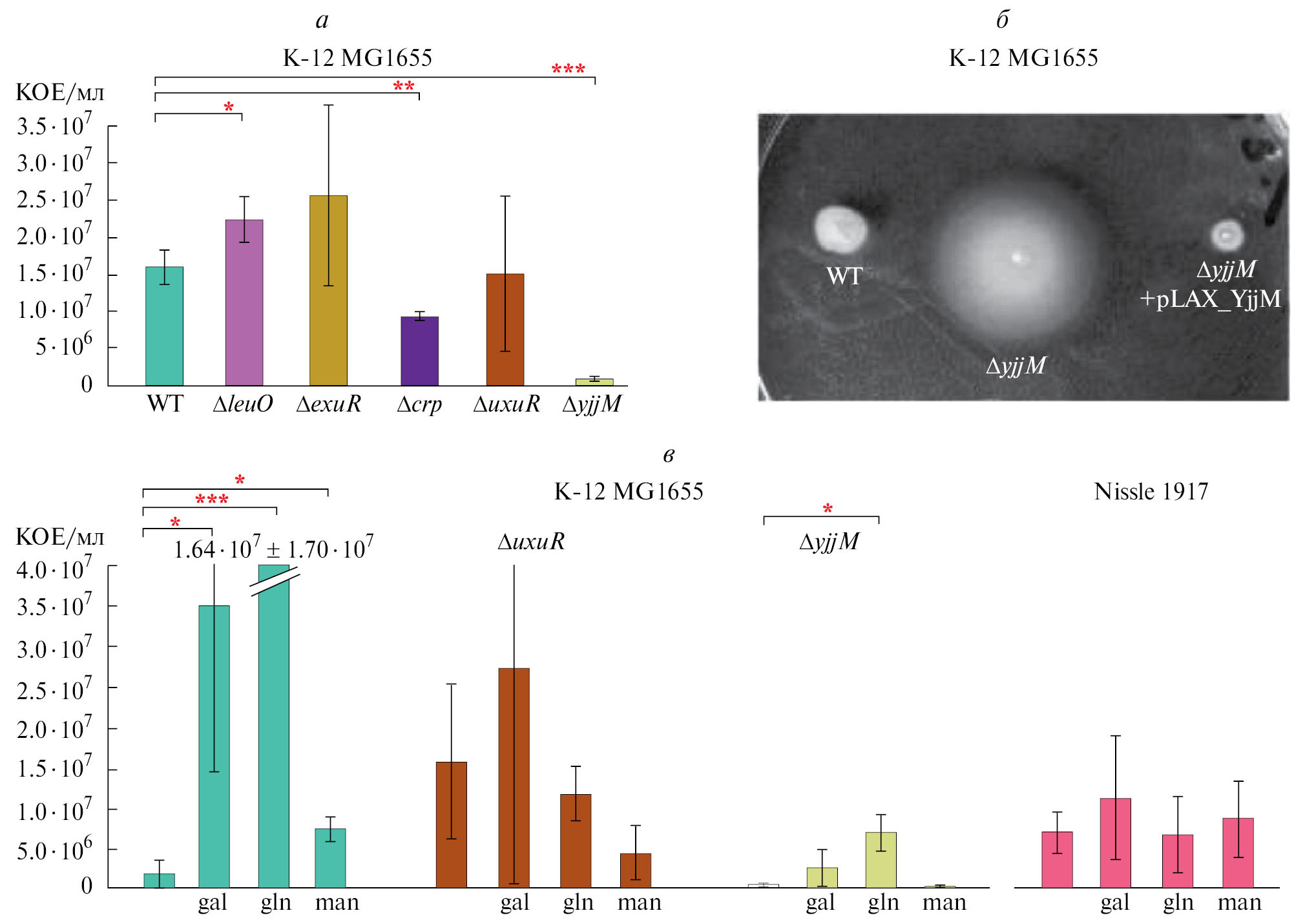 Рис. 1. а – Оценка влияния удаления leuO, uxuR, crp, exuR, yjjM на адгезию E. coli K-12 к клеткам кишечного эпителия CaCo-2; б – подвижность клеток E. coli K-12 в 0.3% LB агаре; в – адгезия E. coli K-12 MG1655 и E. coli Nissle 1917 к клеткам CaCo-2 в присутствии 0.2% D-галактуроната, D-глюкуроната или D-маннозы.