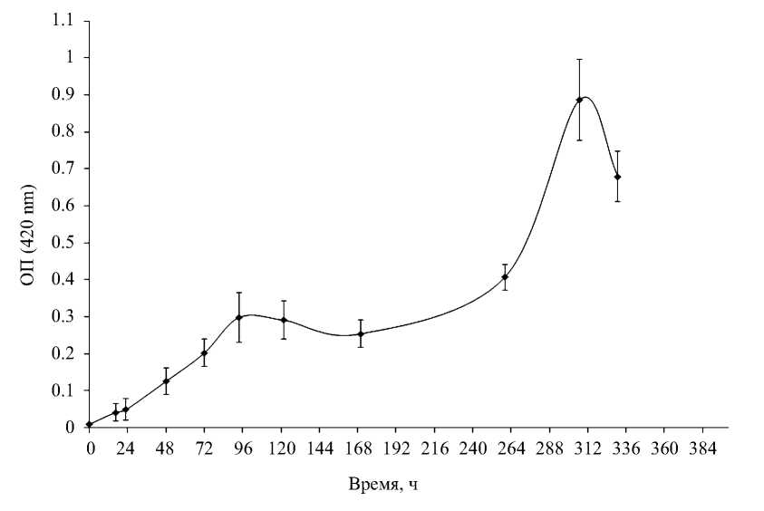 Первая стационарная фаза роста зарегистрирована через 96 ч, вторая – через 307 ч. Скорость роста для обоих пиков была одинаковой и составила 0.017–0.018 ч-1, а время генерации 38.5‒41.0 ч соответственно (рис. 1). Максимальное значение ОП420 было в 2.3 раза выше, чем у исходной культуры LCu2. Прирост сырой биомассы за 307 ч составил 9 мг/мл.