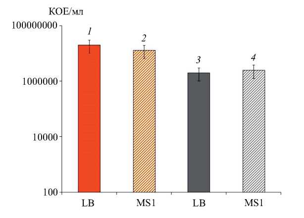 Рис. 2. Жизнеспособность бактерий, культивируемых в течение месяца на коричной кислоте: 1, 2 – культуры, выращенные на 0.5 г/л; 3, 4 – на 1.0 г/л коричной кислоты, высеянные на минерально-синтетическую (MS1) и LB среды; доверительный интервал для р ≤ 0.05.