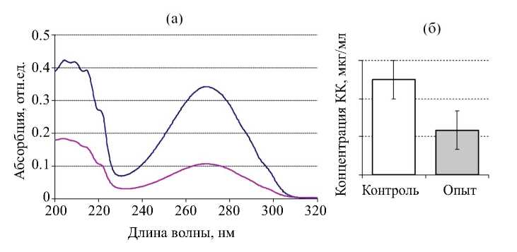 Для количественного определения остаточного содержания в среде КК использовали ВЭЖХ анализ. Убыль КК после культивирования LCu2 составила 266 мг или 53% по сравнению с химическим контролем (рис. 3б). С учетом результатов ВЭЖХ анализа и прироста биомассы рассчитывали эффективность деградации (Q) для адаптированной культуры, которая составила 30 мкг/мг.