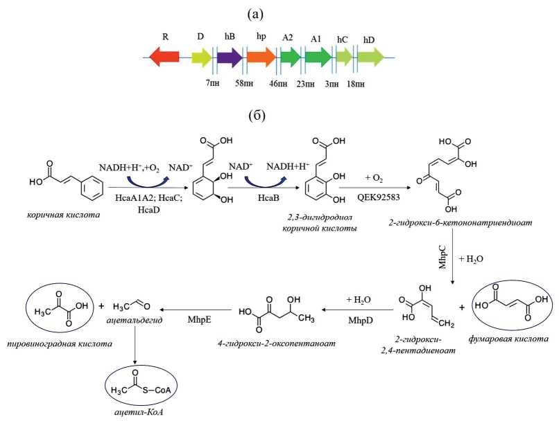 Рис. 5. Структурная организация генного кластера, содержащего hca- и mhp-гены, и предполагаемый биохимический путь деградации коричной кислоты штаммом A. insolitus LCu2. а: R – gntR (транскрипционный регулятор); D – mhpD; hB – hcaB; hp – QEK92583; A2 – hcaA2; A1 – hcaA1; hС – hcaC; hD – hcaD; б: HcaA1A2 – α- и β-субъединицы транс/циннамат диоксигеназы; HcaC – ферредоксин; HcaD – ферредоксинредуктаза; HcaB – 2,3-дигидрокси-2,3-дигидрофенилпропионат дегидрогеназа; QEK92583 – гипотетический белок – предположительно, экстрадиольная диоксигеназа; MhpC – 2-гидрокси-6-оксононадиендиоат/2-гидрокси-6-оксононатриендиоат гидроксилаза; MhpD – 2-кето-4-пентоноат гидратаза; MhpE – 4-гидрокси-2-оксовалериат альдолаза. Овалами обозначены центральные метаболиты.