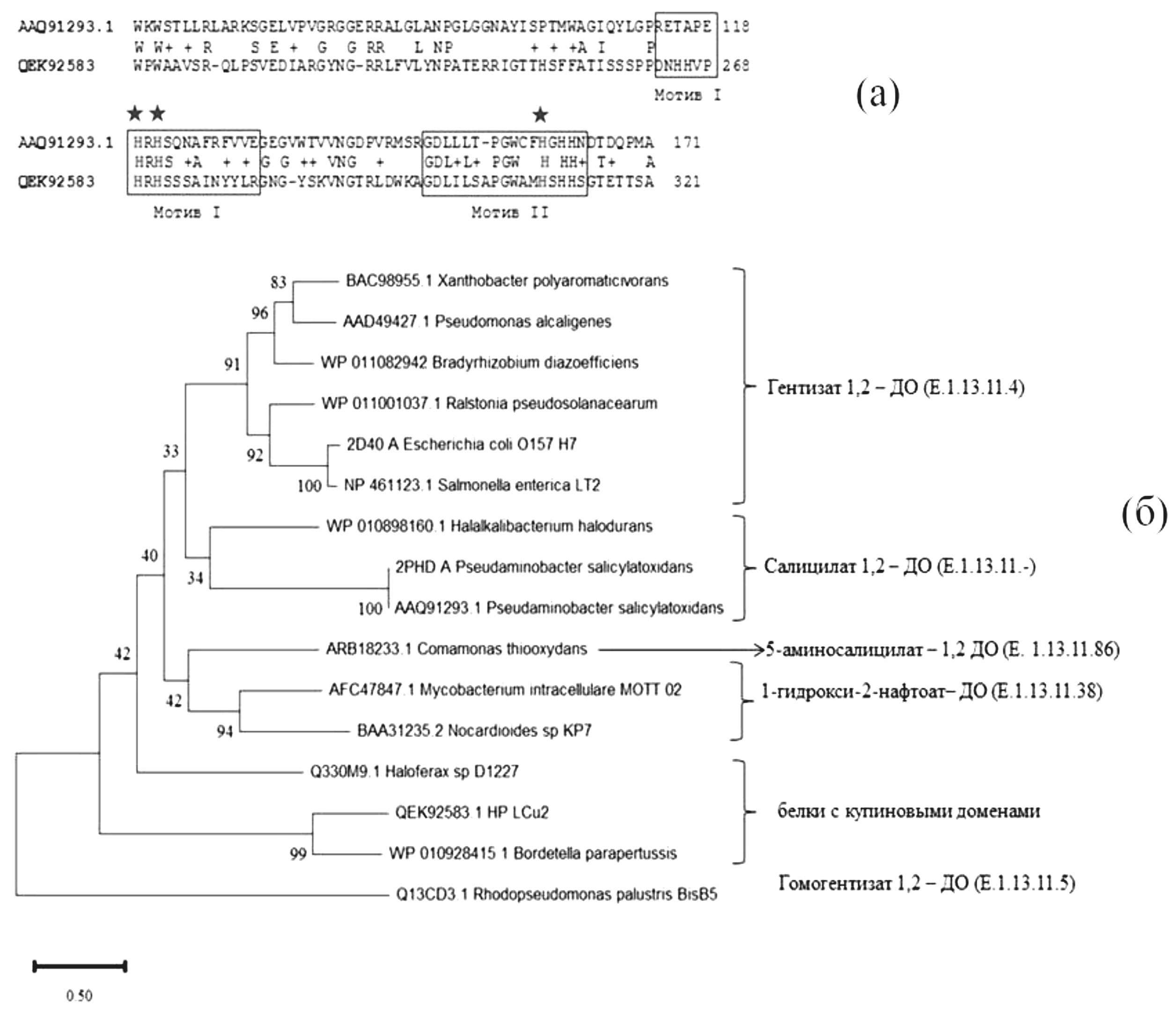Рис. 6. Биоинформатический анализ аминокислотной последовательности (QEK92583) из A. insolitus LCu2: а ‒ сравнение фрагментов аминокислотных последовательностей салицилат 1,2-диоксигеназы из P. salicylatoxidans BN12 (AAQ91293.1) и гипотетического белка A. insolitus LCu2 (QEK92583). Купиновый домен с тремя остатками гистидина (His119; His121 и His160), координирующими Fe2+ в каталитическом центре (Matera et al., 2008), отмечен голубыми прямоугольниками и звездами, и обозначен как Мотив I и Мотив II; б ‒ филогенетический анализ белков с купиновыми доменами методом Maximum-Likelihood в Mega X (Kumar et al., 2018), бутстрэп 1000, последовательности выровнены в ClustalOmega W с настройками по умолчанию; корень – гомогентизат 1,2-диоксигеназа.