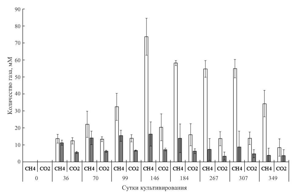 Обнаружено, что в присутствии ВПС у анаэробного микробного сообщества изменяется количество образованных конечных газообразных продуктов. Показано, что микробное сообщество в МГ условиях в контакте с пластиком продуцирует в 9 раз больше CH4 и в 2.3 раза – CO2, чем в контрольных флаконах. Наибольшую разницу наблюдали на 146 сут культивирования, однако впоследствии она сократилась (рис. 3).