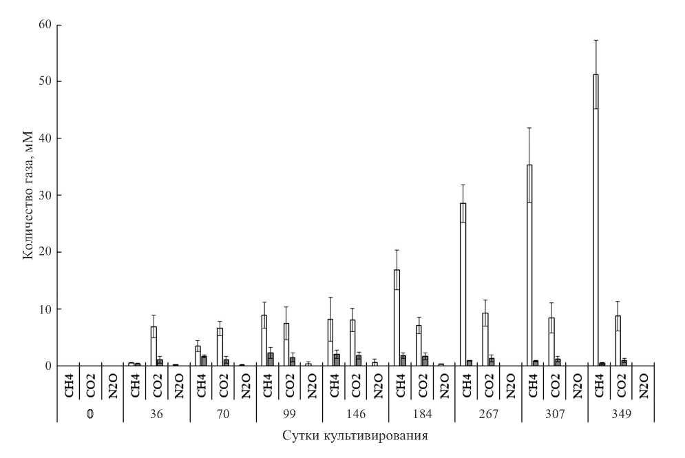 Рис. 4. Динамика образования газов во флаконах с сообществом EPа в НР условиях: белые столбики – опыт в присутствии ВПС, серые – биологический контроль.