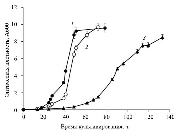 Состав среды и условия культивирования. Культуры поддерживали на агаризованной среде YPD. Инокуляты выращивали на среде YPD (1% дрожжевой экстракт (“Sigma-Aldrich”, США), 2% пептон (“Pronadisa”, Испания) и 2% глюкоза) в колбах Эрленмейера с объемом среды 100 мл при 29°С в течение 24 ч на качалке со 145 об./мин. Для получения кривых роста культуры выращивали на среде YP (1% дрожжевой экстракт, 2% пептон) с добавлением этанола в концентрациях, указанных в подписях к рисункам и таблицам. Объем среды составлял 50 мл, культивирование проводили при 250 об./мин и 29°С. Оптическую плотность культур измеряли на спектрофотометре (“Unico”, США) при 600 нм в кювете толщиной 3 мм. Для получения биомассы культивирование проводили как на среде YPD с глюкозой, так и на среде YP с 4% этанолом в указанных выше условиях.
