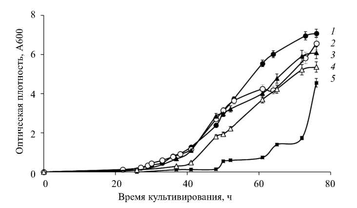 Рис. 2. Рост штамма BY4741 (wt) и штаммов-нокаут мутантов по генам переносчиков фосфата на среде YP с 4% этанолом: 1 – wt; 2 – Δpho87; 3 – Δpho90; 4 – Δpho91; 5 – Δpho89.