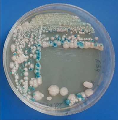 Рис. 1. Дифференциация усваивающих и не усваивающих лактозу дрожжей на селективной среде YPD с добавлением антибиотика хлорамфеникола и субстрата X-gal.