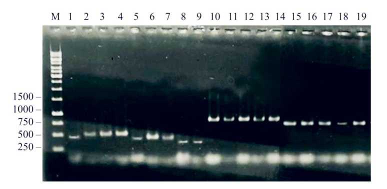 Рис. 2. Размер амплифицированных 5.8S-ITS-фрагментов рДНК штаммов дрожжей, не усваивающих лактозу: 1 – P. manshurica; 2 – P. kudriavzevii; 3, 4 – Candida parapsilosis; 5, 7 – P. fermentans; 6 – Candida boidinii; 8, 9 – Yarrowia lipolytica; 10‒14 – Saccharomyces cerevisiae; 15‒19 – Monosporozyma unispora. М – маркер молекулярных весов (п.н.) 1 kb DNA Ladder (“Fermentas”, Литва).