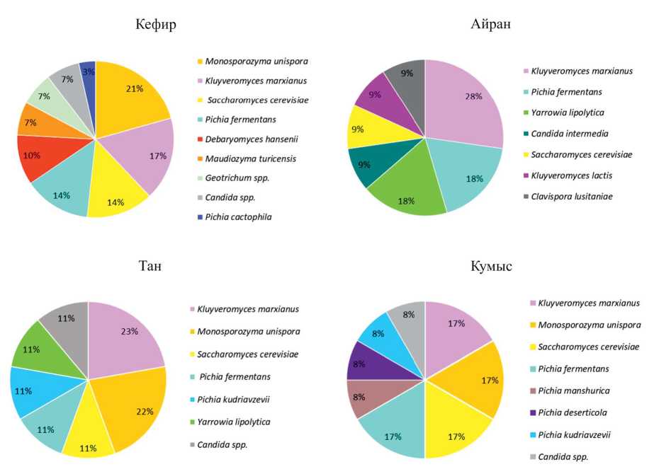 Дрожжевая микрофлора изученных молочных продуктов представлена как усваивающими лактозу (Kluyveromyces, Debaryomyces и Candida), так и негативными по этому признаку дрожжами Saccharomyces, Maudiozyma, Monosporozyma, Pichia, Yarrowia, Geotrichum, Clavispora, Magnusiomyces, Candida и Rhodotorula. В различных молочных продуктах обнаружено семь видов рода Pichia: P. fermentans, P. inconspicua, P. kudriavzevii, P. cactophila, P. membranifaciens, P. manshurica и P. deserticola. Последние два вида характерны только для кумыса, в изготовлении которого используется кобылье молоко. Наиболее часто встречающимся видом рода Pichia были дрожжи P. fermentans.