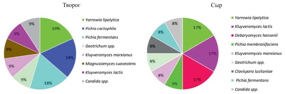 Как в сыре, так и в твороге обнаружены два вида Kluyveromyces (K. lactis и K. marxianus), дрожжи Yarrowia lipolytica, Pichia fermentans и Geotrichum galactomycetum (рис. 4).