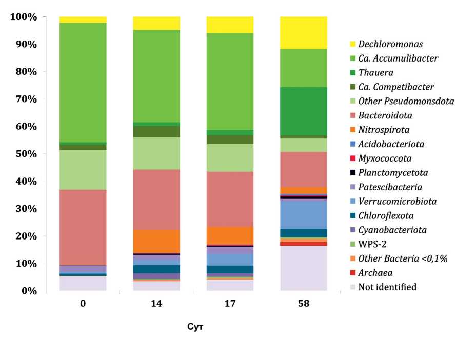 Доля Ca. Accumulibacter в течение 58 сут снизилась с 43.6 до 13.9 %, тогда как доли двух других таксонов, включающих представителей ФАО, – Dechloromonas и Thauera возросли с 2.24 до 11.83 и с 0.82 до 17.58% соответственно. Замещения ФАО типичными представителями группы ГАО мы не наблюдали: в течение эксперимента доля фрагментов гена 16S рРНК основного представителя ГАО – Са. Competibacter была незначительной и составляла 1–4%. Подобное частичное замещение Са. Accumulibacter представителями Dechloromonas в слабокислой области отмечено в работе (Tu, Schuler, 2013): выращивание ФАО-сообщества при рН 6.4–7.0 (но при обязательном условии низкой концентрации ацетата в биореакторе) привело к снижению доли ОТЕ Са. Accumulibacter с 80 до 60%, тогда как доля Dechloromonas увеличилась до 16%. При этом в сумме представители этих таксонов составили 76–80%, и сохранился ФАО-фенотип культуры.