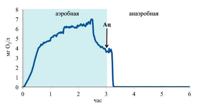 После изменения кислотности значения рН в анаэробной и аэробной фазах снизились до 6.6–6.8 и 6.9–7.4 соответственно. Ацетат в анаэробной фазе полностью потреблялся, однако количество выделенного фосфата снизилось вдвое, и Р/Ац понизилось до 0.5–0.6 Р-моль/Ац-моль. Этот факт соответствует существующим представлениям о снижении расхода энергии на транспорт ацетата при более низких рН и, соответственно, снижении гидролиза внутриклеточных полифосфатов и выбросу ортофосфата из клеток ФАО (Filipe et al., 2001c). Вместе с тем содержание фосфора в биомассе в конце аэробной фазы оставалась высоким (15–16%), и эффективность удаления фосфатов в течение эксперимента существенно не изменилась, составив 92–94%.
