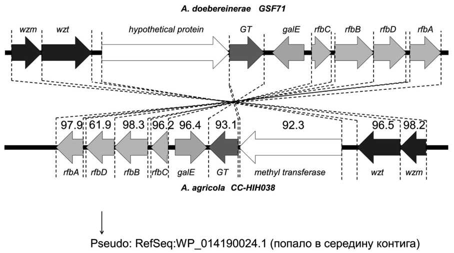 Для выяснения генетической основы родства близких по структуре ОПС A. agricola CC-HIH038T и A. doebereinerae GSF71T был выполнен анализ данных полногеномного секвенирования исследуемых штаммов. Было показано, что локусы биосинтеза ОПС двух исследуемых штаммов очень схожи по содержанию генов и организации (рис. 5).