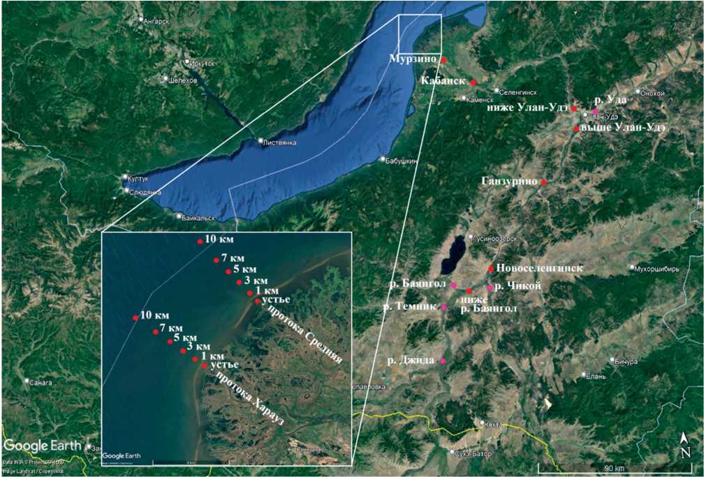 Большая часть годового стока (56%) р. Селенги формируется на территории России. В российской части в Селенгу впадает около 30 притоков, основные из них (Джида, Чикой, Темник, Хилок, Уда) находятся в пределах буферной экологической зоны озера Байкал. Воды рек Чикой, Джида и Темник характеризуются преимущественно дождевым типом питания, р. Уда – снеговым, а р. Баян-Гол подпитывается стоком из озера Гусиное, испытывающего значительную антропогенную нагрузку (Иванова, 2021). В бассейне Селенги расположено большое количество промышленных и сельскохозяйственных предприятий, а также населенных пунктов, сточные воды которых сбрасывают в реку и ее притоки. Наибольший объем загрязняющих веществ в р. Селенгу вносится с притоками Хилок и Чикой (Зомонова и соавт., 2014), в бассейнах которых осуществляется добыча полезных ископаемых (Государственный доклад, 2018). На качество воды р. Джиды оказывают влияние с бросы шахтных и дренажных вод недействующего ОАО “Джидинский вольфрамомолибденовый комбинат”, содержащие значительное количество меди, цинка, кадмия, фтора и сульфатов. В реку Уда осуществляется сброс сточных вод с ОАО “Авиационный завод” и с очистных сооружений Улан-Удэнской ТЭЦ-1.