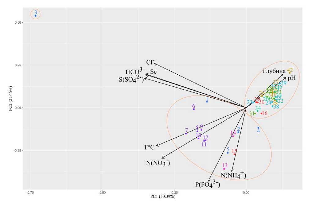 Анализ физико-химических данных с помощью метода главных компонент выявил два кластера: первый включал речные пробы и поверхностную пробу на расстоянии 1 км от устья протоки Kh; второй – 27 образцов из зоны Селенгинского мелководья (рис. 2).