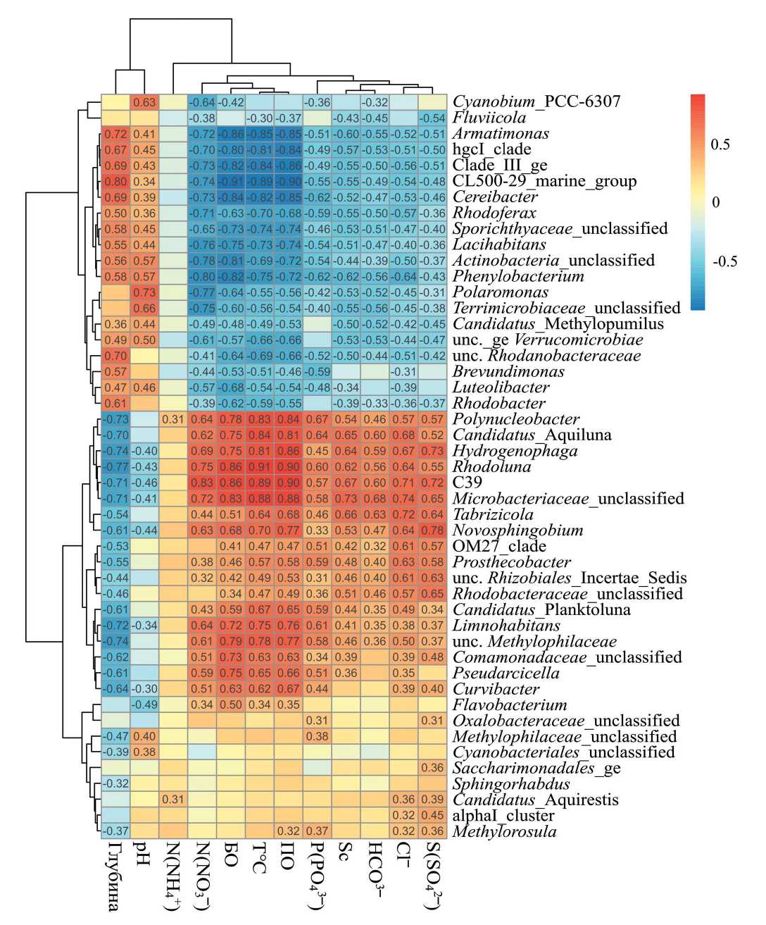 На тепловой карте корреляционных связей между доминирующими родами бактерий и физико-химическими параметрами (рис. S1) выявлено два кластера: один включает роды, преобладающие в сообществах Селенгинского мелководья; второй – роды, преобладающие в речных сообществах. Преобладающие в Селенгинском мелководье и открытом Байкале представители родов Clade_III_ge, Rhodoferax, CL500-29_marine_group отрицательно коррелировали с концентрациями главных ионов, биогенных элементов, значениями химического окисления органических веществ (БО и ПО) и температурой, а также положительно коррелировали с глубиной водной толщи. Доминирующие в речных образцах последовательности родов Rhodoluna, Polynucleobacter, С39 положительно взаимосвязаны с теми же физико-химическими параметрами и отрицательно – с глубиной и рН.