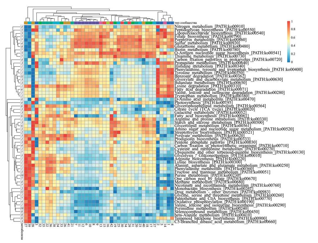Предсказанные для сообществ относительные доли генов из различных функциональных “KEGG” категорий показали, что в реках и поверхностных образцах Селенгинского мелководья более распространены пути азотного и серного метаболизмов, биосинтез и метаболизм гликанов, а также метаболизм и биосинтез таких кофакторов и витаминов, как фолат и порфирин (рис. S2). Схожие пути метаболизма отмечены для сообществ четырех притоков (исключая сообщества р. Баян-Гол) и устья протоки S, где преобладали пути биосинтеза и биодеградации комплекса аминокислот; деградации бензоата; метаболизма бутаноата, глиоксилатного и дикарбоксилатного метаболизма и деградации жирных кислот. Пути предсказанного метаболизма для сообществ р. Селенги хотя и были схожи с таковыми притоков и поверхностных образцов Селенгинского мелководья, но формировали отдельную кладу.