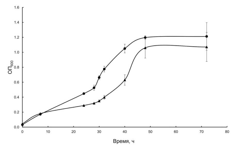 Рис. 1. Кривые роста штаммов MIR/pAWP-Pphac (1) и MIR/pAWP-pepc (2).