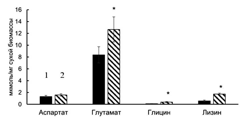 Рис. 2. Накопление аминокислот клетками штаммов MIR/pAWP-Pphac (1) и MIR/pAWP-pepc (2). Бары представляют стандартное отклонение для трех независимых экспериментов. Для определения статистической значимости различий использовали тест Стьюдента; *p < 0.05.