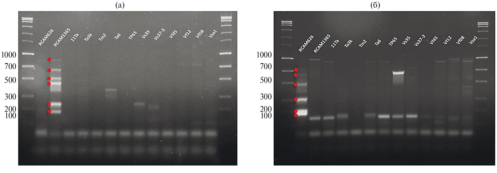 Рис. 3. Мультиплексная ПЦР с 10-ю парами праймеров для маркирования штаммов: а ‒ штамм RCAM1365 (фрагменты 1, 2, 3, 5, 6, 7 в соответствии с табл. 2 отмечены красными точками); б ‒ штамм RCAM0626 (фрагменты 1, 2, 4, 5, 6, 8 в соответствии с табл. 3 отмечены красными точками). В качестве контролей использованы штаммы RCAM0626, RCAM1365 и 11 штаммов R. leguminosarum различного происхождения.