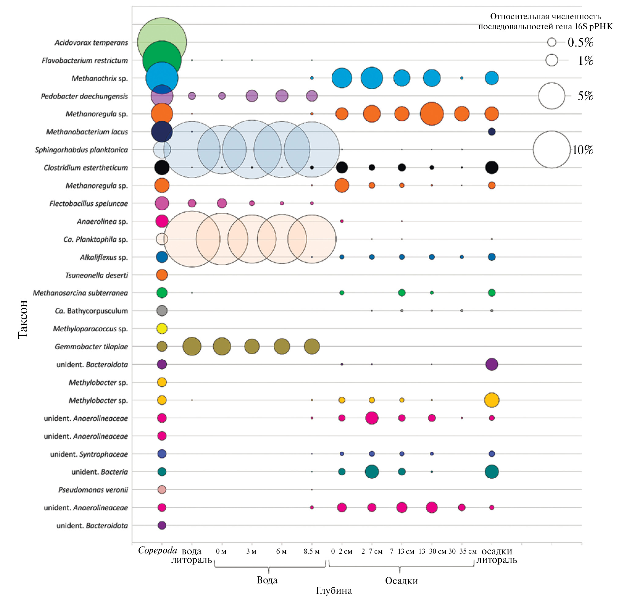 Для 16S рРНК профилирования использовали интегральные пробы воды (5 образцов) с глубин 0, 3, 6, 8.5 м (глубоководная зона) и 0.2 м (зона литорали), а также осадков (6 образцов) с глубин 0‒2, 2‒7, 7‒13, 13‒30 и 30‒35 см (глубоководная зона) и 0‒5 см (зона литорали). Для этого 3 образца (биологические повторности) воды с конкретной глубины и 3 колонки осадков отбирали на площади 1 м2 и объединяли по горизонтам в одной склянке. Колонку осадков предварительно делили на сектора. Биомассу живых рачков отбирали из всех проб воды по профилю в одну интегральную пробу, отмывали в этаноле и гомогенизировали с жидким азотом перед процедурой выделения ДНК. После отбора копепод, образцы воды фильтровали через мембранные фильтры (диаметр пор 0.2 мкм).