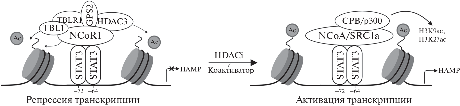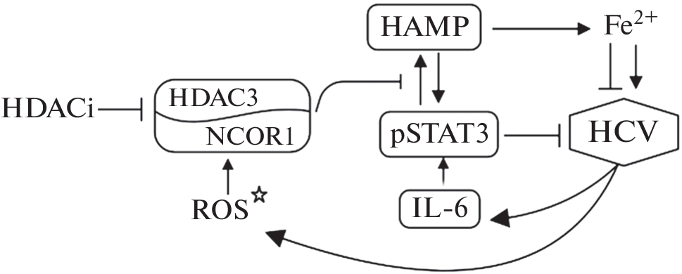The key role of histone deacetylases (HDACs) in the regulation of the cellular response to infection with the hepatitis C virus (HCV) was first demonstrated in 2008. Studying the metabolism of iron in the liver tissues of patients with chronic hepatitis C, the authors found that the expression of the hepcidin gene (HAMP), a hormone regulator of iron export, is markedly reduced in hepatocytes under conditions of oxidative stress caused by viral infection. HDACs were involved in the regulation of hepcidin expression through the control of acetylation level of histones and transcription factors, primarily STAT3, associated with the HAMP promoter. The purpose of this review is to summarize current data on the functioning of the HCV-HDAC3-STAT3-HAMP regulatory circuit as an example of a well-characterized interaction between the virus and the epigenetic apparatus of the host cell.