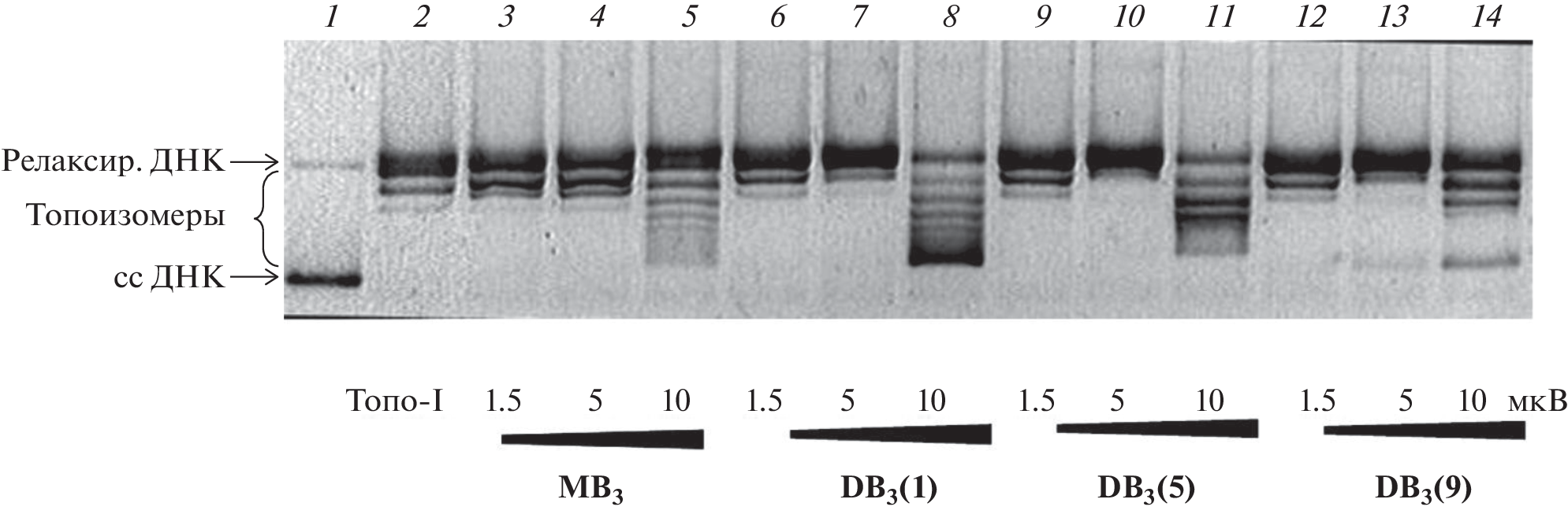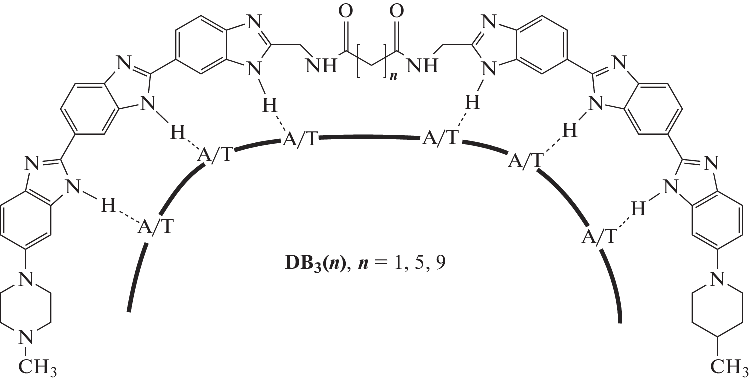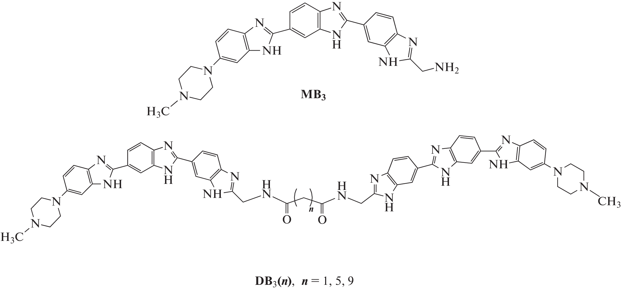 Синтезирована серия новых флуоресцентных узкобороздочных лигандов DB3(n) и охарактеризованы свойства этих лигандов. Соединения DB3(n) на основе димерных трисбензимидазолов обладают способностью связываться с АТ-участками ДНК. Синтез DB3(n), трисбензимидазольные фрагменты которых связаны олигометиленовыми линкерами разной длины (n = 1, 5, 9), основан на конденсации мономерного трисбензимидазола MB3 с α,ω-алкилдикарбоновыми кислотами. DB3(n) в субмикромолярной концентрации (0.20–0.30 мкМ) оказались эффективными ингибиторами каталитической активности интегразы ВИЧ-1. Обнаружено, что DB3(n) ингибирует каталитическую активность ДНК-топоизомеразы I в низких микромолярных концентрациях.
