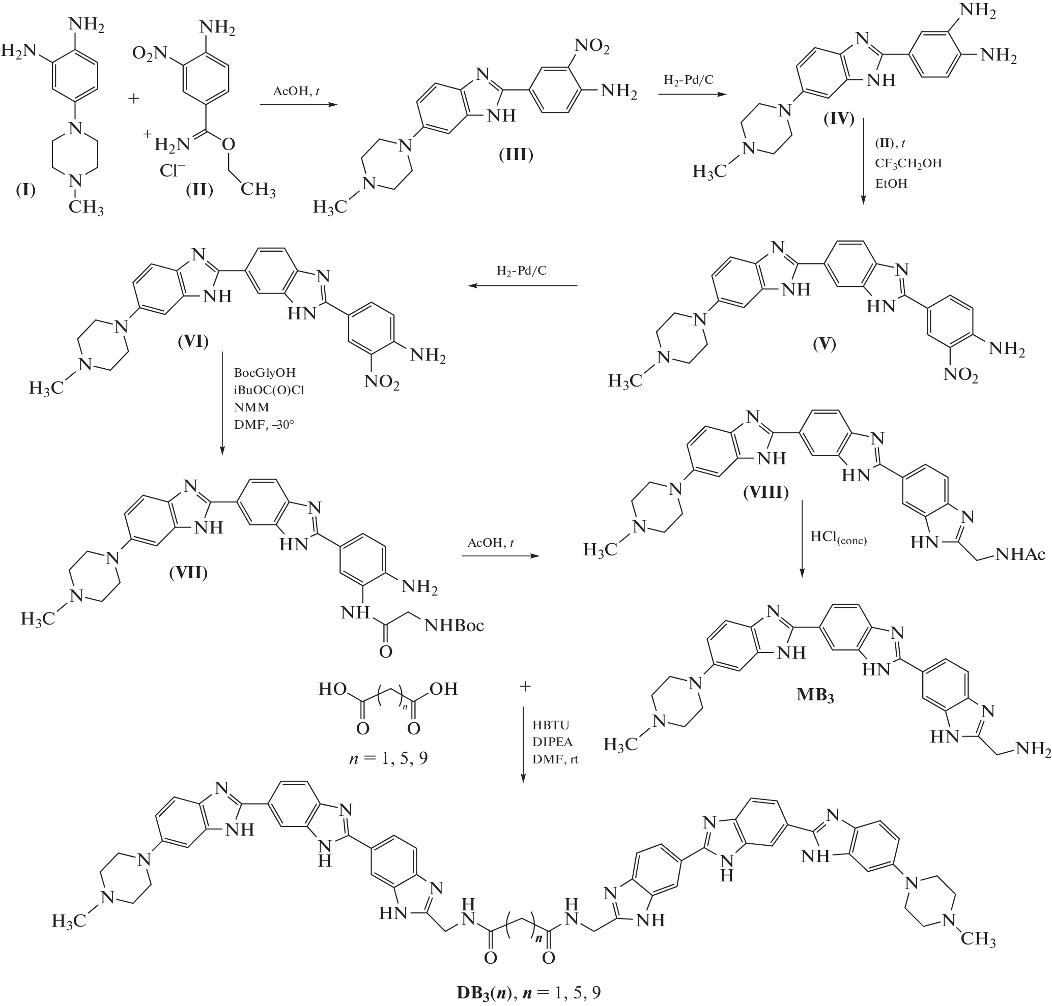 Лиганды, специфичные к определенным последовательностям пар оснований ДНК. XIX. Синтез, спектральные характеристики, вирусологические и биохимические исследования флуоресцентных симметричных димерных трисбензимидазолов DB3(n)