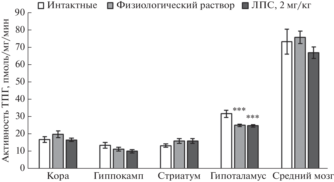 Tryptophan hydroxylases 1 and 2 (TPH1 and TPH2) play the key role in the synthesis of a neurotransmitter and hormone, serotonin (5-HT) in peripheral organs and in the brain, respectively. The main aim of the present study was to clarify the distribution of mRNA of Tph1 and Tph2 genes in brain structures in norm and after inflammation. The experiments were carried out on young (4 weeks old) males of C57BL/6 mice. The animals were divided into three groups: intact, control, injected ip with saline, and injected ip with 2 mg/kg of bacterial lipopolysaccharide (LPS). Markers of inflammation, spleen and thymus mass were assayed 5 days after the saline or LPS administration. In their frontal cortex, hippocampus, striatum, hypothalamus and midbrain the concentrations of 5-HT, its main metabolite, 5-hydroxyindole acetic acid (5-HIAA), and TPH activity were assayed in using HPLC, while Tph1 and Tph2 mRNA were quantified by quantitative real-time RT-PCR. Dramatic increase of spleen mass and decrease of thymus mass 5 days after LPS administration was shown. Significant increase of 5-HT and 5-HIAA levels in midbrain as well as decrease of 5-HIAA concentration and TPH activity in hypothalamus in mice treated with LPS and saline compared with intact animals was revealed. The highest concentration of Tph2 gene mRNA was observed in midbrain in 5-HT neuron bodies, while in this gene mRNA level was lower in 5-HT endings (cortex, hippocampus, striatum and hypothalamus). Trace amounts of Tph1 mRNA was revealed in all studied brain structures in mice of the three groups. Thus, Tph1 gene expression in the mouse brain is too low to significantly affect 5-HT synthesis in normal conditions and during inflammation.