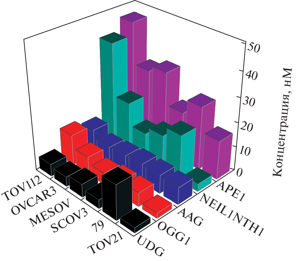 The important role of DNA damage in the occurrence of various diseases, including cancer, stimulates studies of the mechanisms of genetic information stability, carried out since the discovery of DNA repair systems. The question of the relationship between the accumulation of DNA damage, disorders in DNA repair pathways, and an increased risk of diseases developing still remains relevant. Over the past few years, significant efforts have been made to develop methods for analyzing the activity of DNA repair enzymes in human cells. In this work, we developed fluorescent DNA probes that allow us to determine the activity of key enzymes of base excision DNA repair in cell extracts, namely DNA glycosylases UNG2, SMUG1, MBD4, TDG, AAG, NEIL1, NTHL1, and OGG1 and AP endonuclease APE1. The sensitivity of DNA probes was determined on purified enzyme preparations. Determination of the activity of repair enzymes in cell extracts of the human ovarian tumor lines TOV112, 79, OVCAR3, MESOV, SCOV3, and TOV21 revealed a significant variability in the level of enzyme activity in these cell lines. Obtained results can become the test system platform for analyzing the activity of the base excision DNA repair system in the human body.