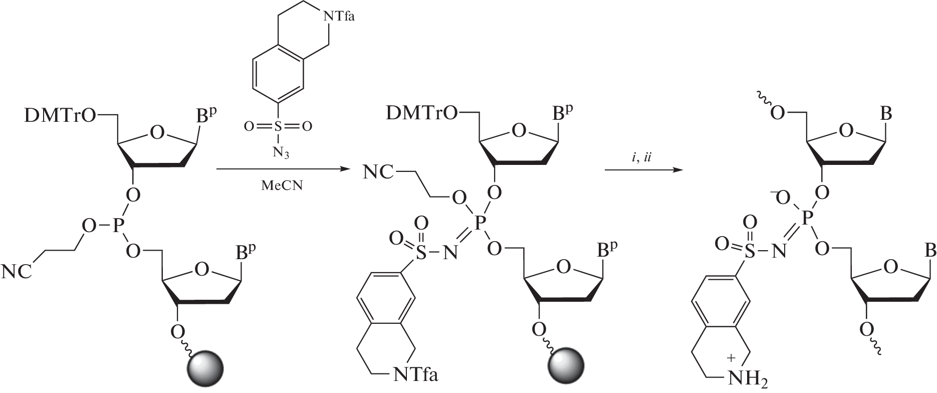 New zwitter-ionic oligonucleotide derivatives containing 1,2,3,4-tetrahydroisoquinoline-7-sulfonyl phosphoramidate group are described. Automated synthesis of these compounds was carried out according to the β-cyanoethyl phosphoramidite scheme using the Staudinger reaction between 2-trifluoroacetyl-1,2,3,4-tetrahydroisoquinoline-7-sulfonyl azide and phosphite triester within an oligonucleotide grafted to a polymer support. 1,2,3,4-Tetrahydroisoquinoline-7-sulfonyl phosphoramidate group (THIQ) proved to be stable under the conditions of standard oligonucleotide synthesis, including the removal of protective groups and cleavage of the oligonucleotide from the polymer support by treatment with a mixture of concentrated aqueous solutions of ammonia and methylamine (1 : 1) at 55oC. Oligonucleotides modified by one to five THIQ groups in various positions were obtained. The zwitter-ionic character of the obtained derivatives was reflected in their different mobility under conditions of denaturing PAGE. The thermal stability of the duplexes of oligodeoxynucleotides containing THIQ groups with complementary DNA and RNA differed only slightly from that of natural DNA:DNA and DNA:RNA duplexes. The results obtained suggest the possible use of oligonucleotides modified with zwitterionic THIQ groups as antisense therapeutic agents.