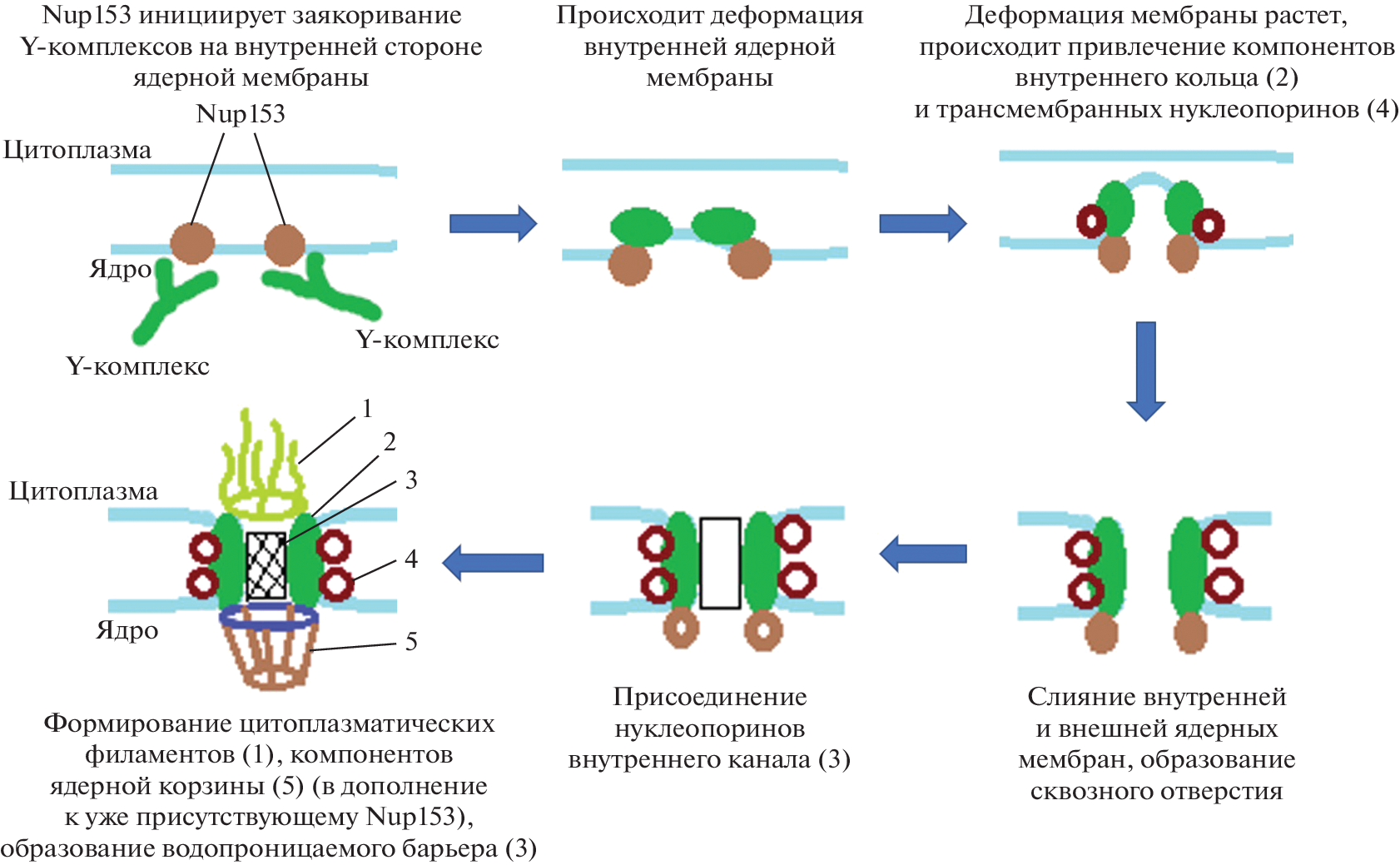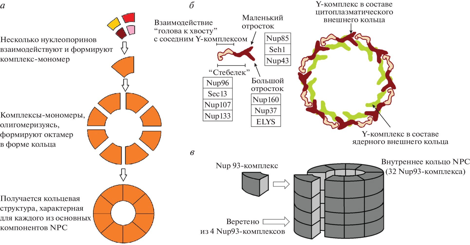 Nucleocytoplasmic exchange in the cell occurs through the nuclear pore complexes (NPCs). NPCs are large multiprotein complexes with octagonal symmetry about their axis and imperfect mirror symmetry about a plane parallel with the nuclear envelop (NE). NPC fuses the inner and outer nuclear membranes and opens up а channel between nucleus and cytoplasm. NPC is built of nucleoporins. Each nucleoporin occurs in at least eight copies per NPC. Inside the NPC forms a permeability barrier by which NPC can ensure fast and selectable transport of molecules from one side of nuclear membrane to another. NPC architecture is based on hierarchical principle of organization. Nucleoporins are integrated into complexes that oligomerizes into bigger octomeric high-order structures. These structures are the main components of NPC. In the first part of this work the main attention is paid to NPC structure and nucleoporins’ properties. The second part is dedicated to mechanisms of NPC assembly and disassembly at different stages of cell cycle.