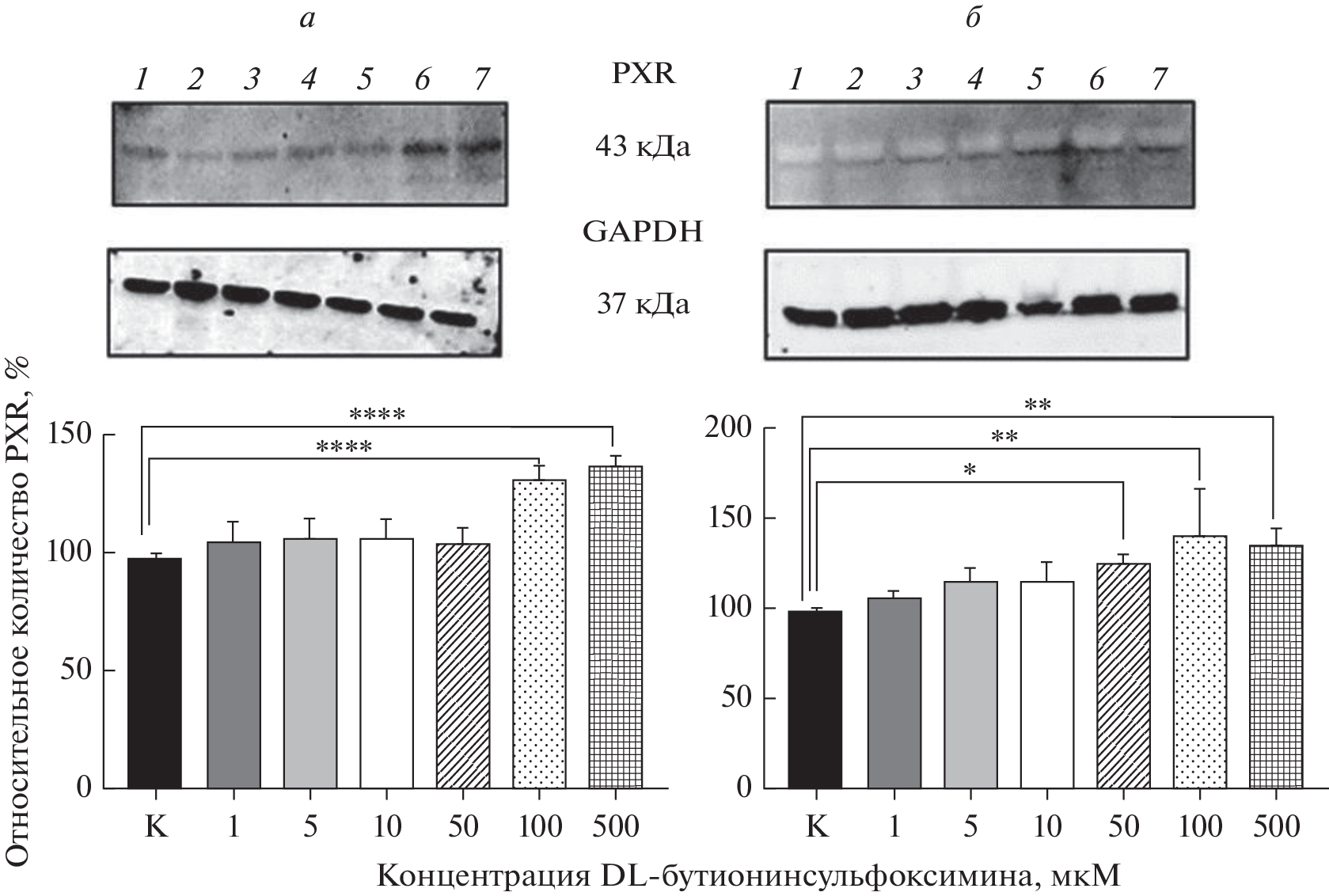 The constitutive androstane receptor (CAR) and the pregnan X receptor (PXR) are nuclear receptors that are involved in the regulation of gene transcription of enzymes responsible for biotransformation and excretion of endo- and xenobiotics. The aim of the study was to study the effect of DL-butyonine sulfoximine (BSO, gamma-glutamylcysteine synthetase inhibitor) on the relative amount of CAR and PXR in Caco-2 cells and to evaluate its mechanisms. BSO was used in concentrations of 1‒500 μM and exposure duration of 24 and 72 h. The generation of reactive oxygen species (ROS) was determined using MitoTracker Red CM-H2 XRos fluorescent probes. Cytotoxicity was analyzed according to the results of the MTT test. The relative amount of CAR and PXR was estimated by the Western blot method. It was shown that BSO caused an increase in the formation of ROS at exposure duration of 24 h at concentrations of 10, 50 and 100 μM, at 72 h – at concentrations of 50, 100 μM. At the same time, at a concentration of 500 μM, BSO reduced the viability of cells during all periods of exposure. The relative amount of CAR increased at BSO concentrations of 50, 100 μM and exposure duration of 24 hours and 10, 50 μM at exposure of 72 h, and PXR – at concentrations of 100 and 500 μM and incubation of 24 h and 50, 100, 500 μM and incubation of 72 h. When used together with BSO, glutathione, the synthesis of which it blocks, it was found that at exposure time of 24 h and BSO concentrations of 50 μM and 72 h and concentrations of 10 and 50 μM, CAR induction was suppressed, and at 50 and 100 μM and exposure time of 72 h – PXR. The introduction of glutathione into the nutrient medium with BSO had no effect on PXR at xenobiotic concentrations of 100 and 500 μM (24 h) and 500 μM (72 h), on CAR – at concentrations of 100 μM (24 h) and 50 and 100 μM (72 h). Thus, BSO can induce CAR and PXR both by increasing the production of free radicals and the development of oxidative stress, and independently as a xenobiotic.