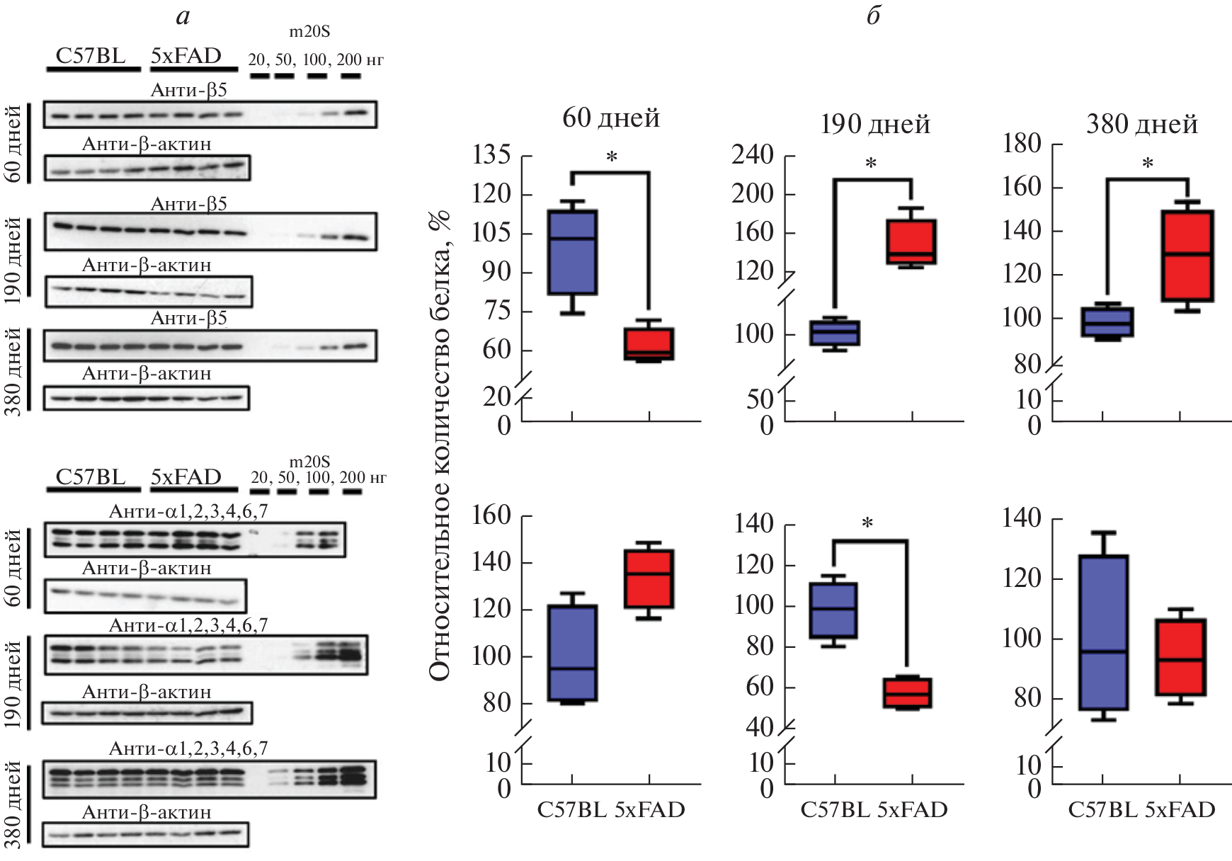 The ubiquitin-proteasome system (UPS) provides hydrolysis of most intracellular proteins in proteasomes. There are various forms of proteasomes differing, among other things, in the set of proteolytic subunits and the presence of activators. Alzheimer’s disease (AD) is characterized by disturbances in the functional state of the UPS. At the same time, an increase in the expression of certain forms of proteasomes, in particular, proteasomes containing immune subunits (non-constitutive proteasomes), was shown. Here, we studied dynamic changes in the expression of catalytic proteasome subunit genes and protein content in the cerebral cortex of animals using a mouse model of AD (5xFAD transgenic mice). In samples from 5xFAD mice, at the age of 380 days, compared with samples from mice of 60 days of age, 4 and 6 times more gene transcripts of the immune subunits PSMB9 and PSMB8 were detected, as well as a significant increase in the number of immune β-subunits (2.8 times – β1i, 2.2 times – β2i) was observed. The results obtained indicate activation of the synthesis of immune subunits and assembly of non-constitutive proteasomes at the terminal stage of pathology development. At the same time, the results of electrophoresis in native conditions indicate the activation of both 20S and 26S proteasomes containing immune subunits in samples from 5xFAD mice, 380 days of age. The obtained data, in combination with available literature, indicate that the activation of non-constitutive proteasomes is a universal phenomenon characteristic of various animal models of AD, that may reflect both the development of neuroinflammation and adaptive processes in tissues.