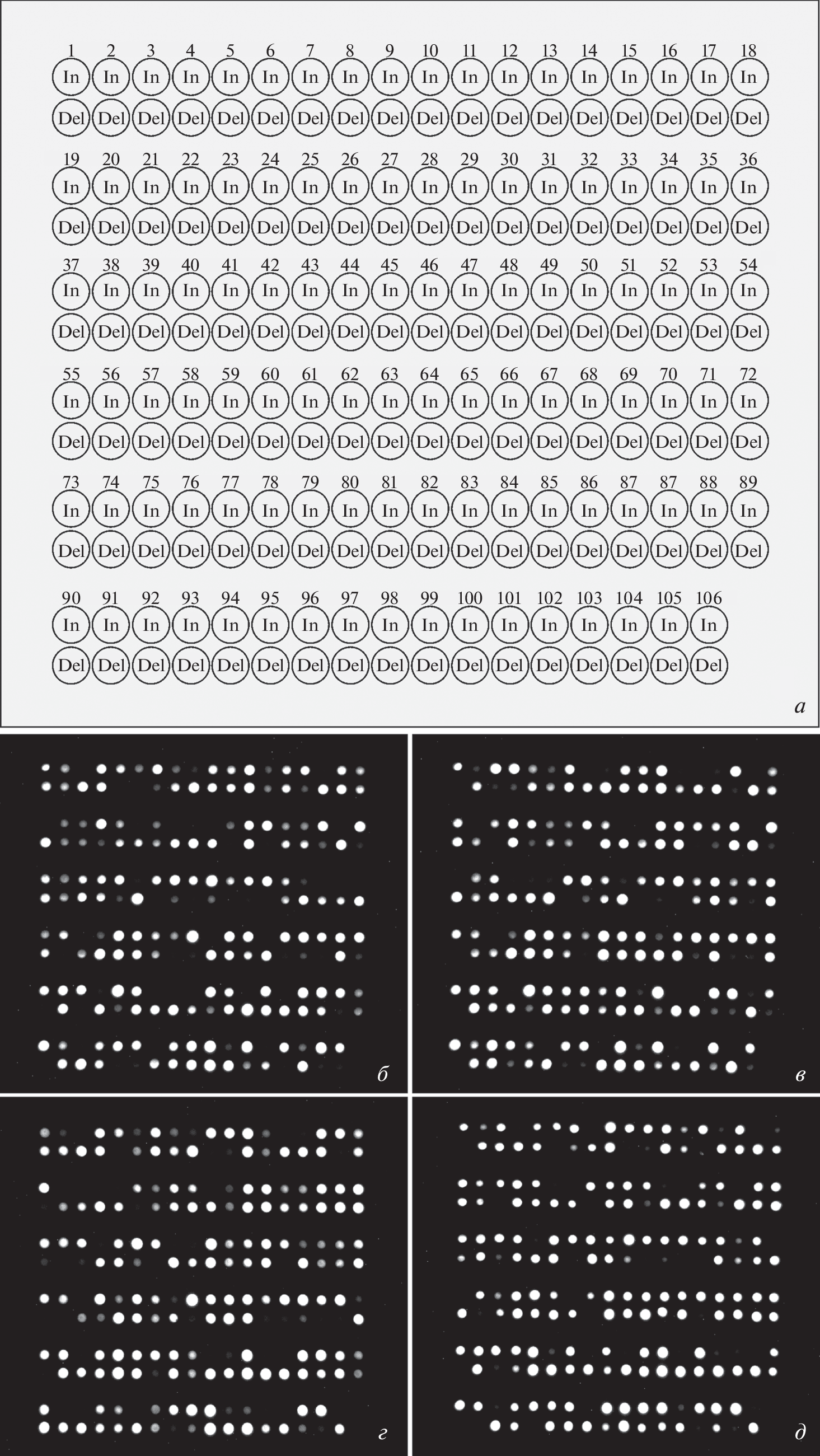 The paper proposes a panel of 106 insertion–deletion (InDel) polymorphisms and practical testing of the method of their genotyping on biochips. Such fundamental properties of InDel markers as short length and low mutation rate provide them with significant advantages in expert practice over widely used tandem repeats (STRs). In this work, we analyzed the allele distribution of InDel polymorphisms in the five largest world populations (European, East Asian, South Asian, African and American), and selected markers that meet the following criteria: minor allele frequency of more than 0.30, physical distance between markers more than 3 million bp, the absence of polymorphisms, tandem repeats and palindromes in the flanking sequences, the proximity of the AT/GC ratio to 1. As a result, a panel of 106 polymorphisms was formed with an average frequency of the minor allele for all five populations of 0.396. For panel genotyping, a method was developed that included one-step multiplex PCR followed by hybridization on a biological microarray. The average amplicon length was 72 bp. On a sample of 201 residents of Moscow and St. Petersburg, the main characteristics of the formed panel were determined: the probability of a random match (MP) 1.89 × 10–43, the paternity exclusion potential (CPE) 0.99999999063. The proposed method is an alternative to molecular genetic identification of a person based on variations in the lengths of STR loci.