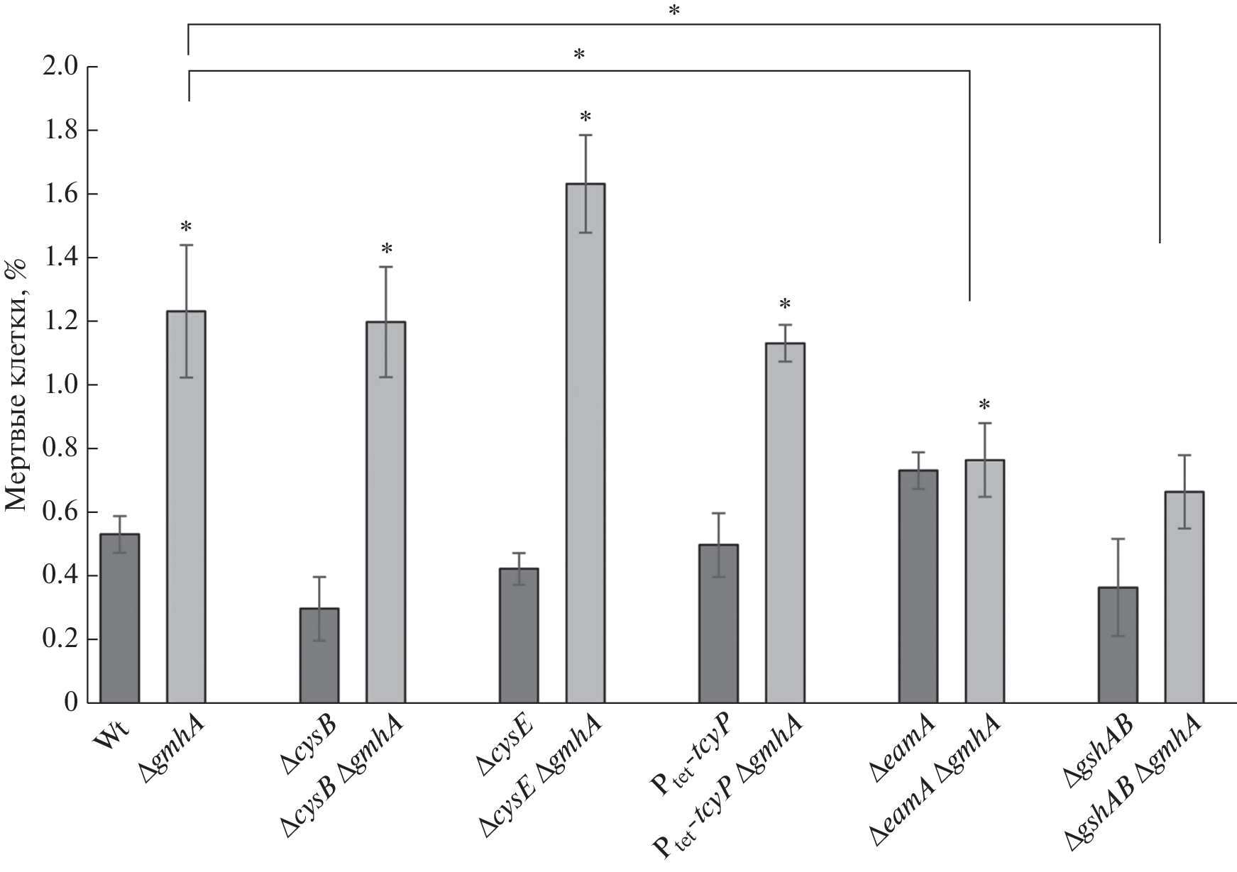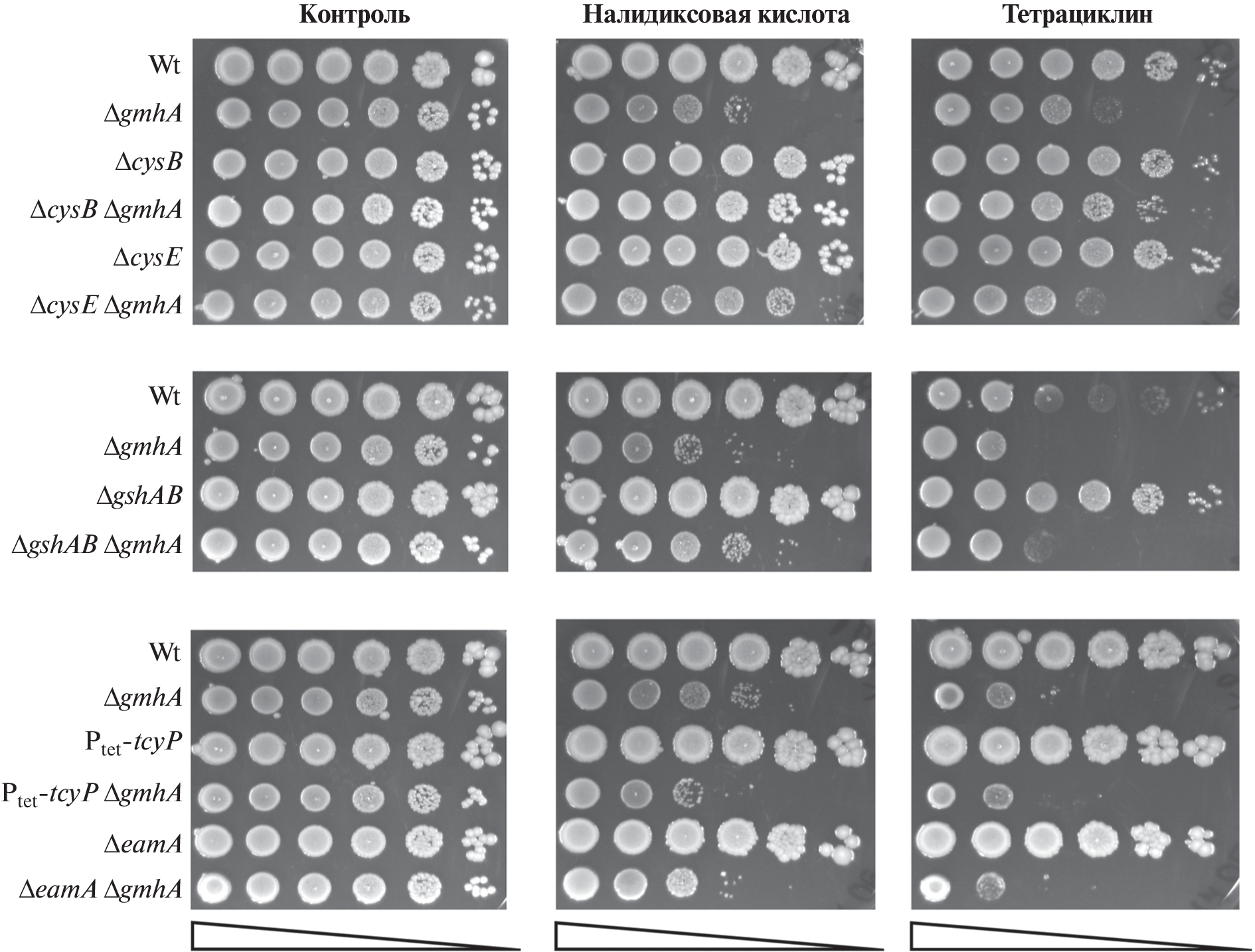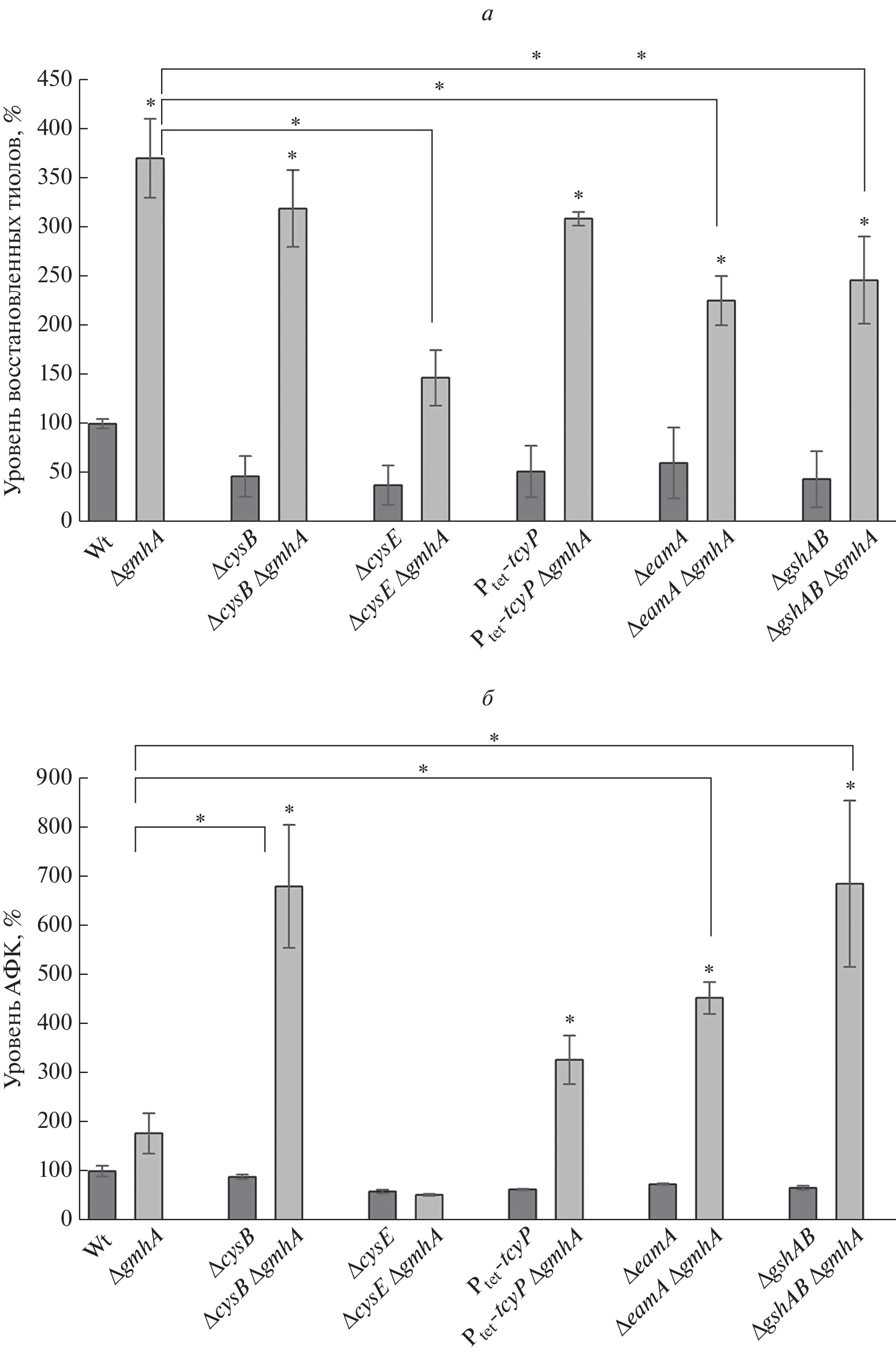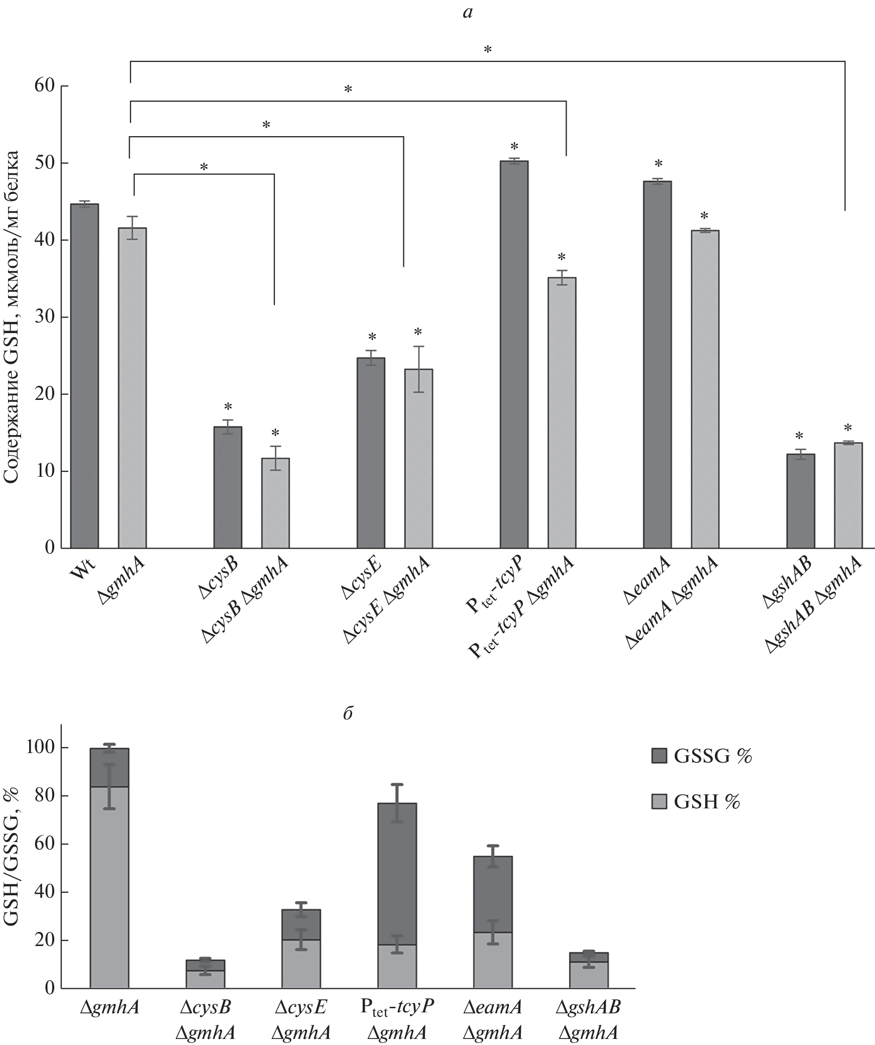 Низкомолекулярные тиолы, такие как глутатион и цистеин, являются неотъемлемой частью системы редокс-регуляции клетки. Ранее мы показали, что на фоне инактивации синтеза ADP-гептозы, связанной с делецией gmhA, в клетках Escherichia coli развивается окислительный стресс, сопровождающийся перестройкой гомеостаза тиолов и повышением чувствительности к антибиотикам. В представленной работе обнаружено, что ограничение метаболизма цистеина (∆cysB и ∆cysE) и ингибирование синтеза глутатиона (∆gshAB) приводят не к ожидаемому возрастанию, а к снижению чувствительности мутанта ∆gmhA к антибиотикам. В то же время блокирование экспорта цистеина (∆eamA) или увеличение импорта (Ptet-tcyP) цистина, являющего окисленной формой цистеина, приводит к еще большей чувствительности клеток с делецией gmhA к антибиотикам. Кроме того, не наблюдается корреляции цитотоксического действия антибиотиков с уровнем активных форм кислорода, общим пулом тиолов или жизнеспособностью исходной популяции клеток. Однако выявлена корреляция между чувствительностью к антибиотикам и долей окисленного глутатиона в клетках. Снижение содержания низкомолекулярных тиолов, по-видимому, сберегает эквиваленты NADP-H и ограничивает процессы редокс-модификации белков, повышая устойчивость штамма ∆gmhA к действию антибактериальных препаратов, тогда как повышение их уровня, напротив, требует большего расхода ресурсов клетки, приводит к росту окисленного глутатиона и вызывает еще большее увеличение чувствительности данного штамма E. coli к антибиотикам.