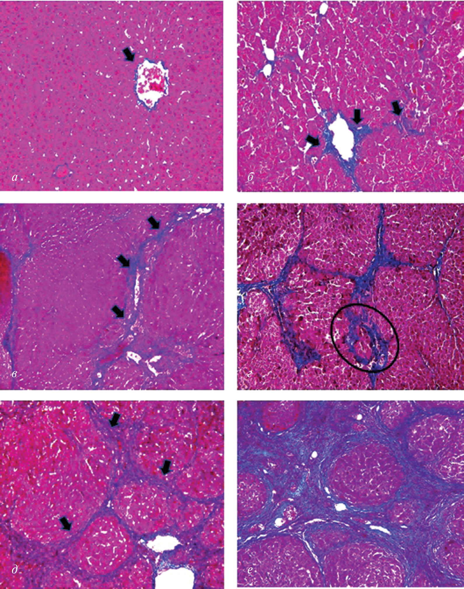 Рис. 1. Фрагменты печени крыс контрольной группы (а) и крыс с индуцированным циррозом через 3 (б), 5 (в), 9 (г), 11 (д) и 17 нед. (е) после начала эксперимента. Окраска по Маллори. ×40 (а, б, д, е); ×20 (в, г). а – Центральная вена (стрелка); б – фиброзная соединительная ткань (стрелки); в – фиброзные септы между портальными зонами (стрелки); г – ложная печеночная долька (выделена овальной рамкой); д – ложные печеночные дольки (стрелки); е – выраженная деструкция печени.